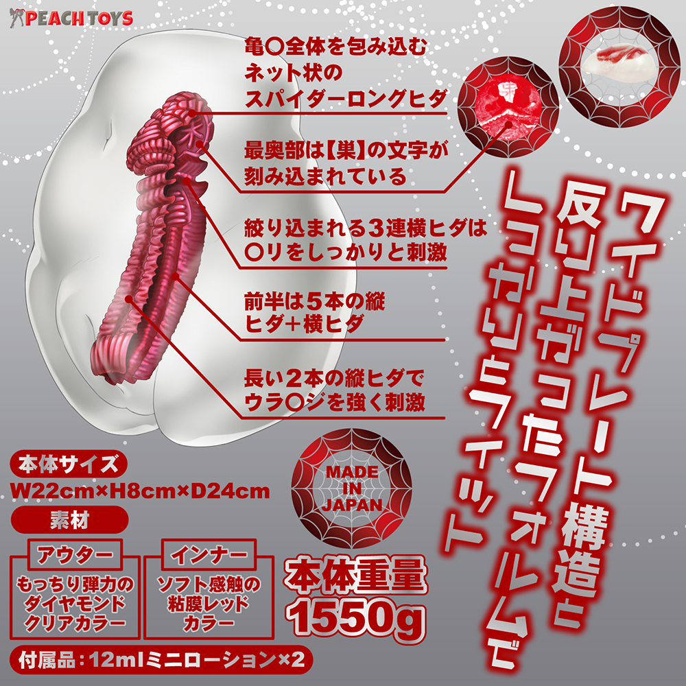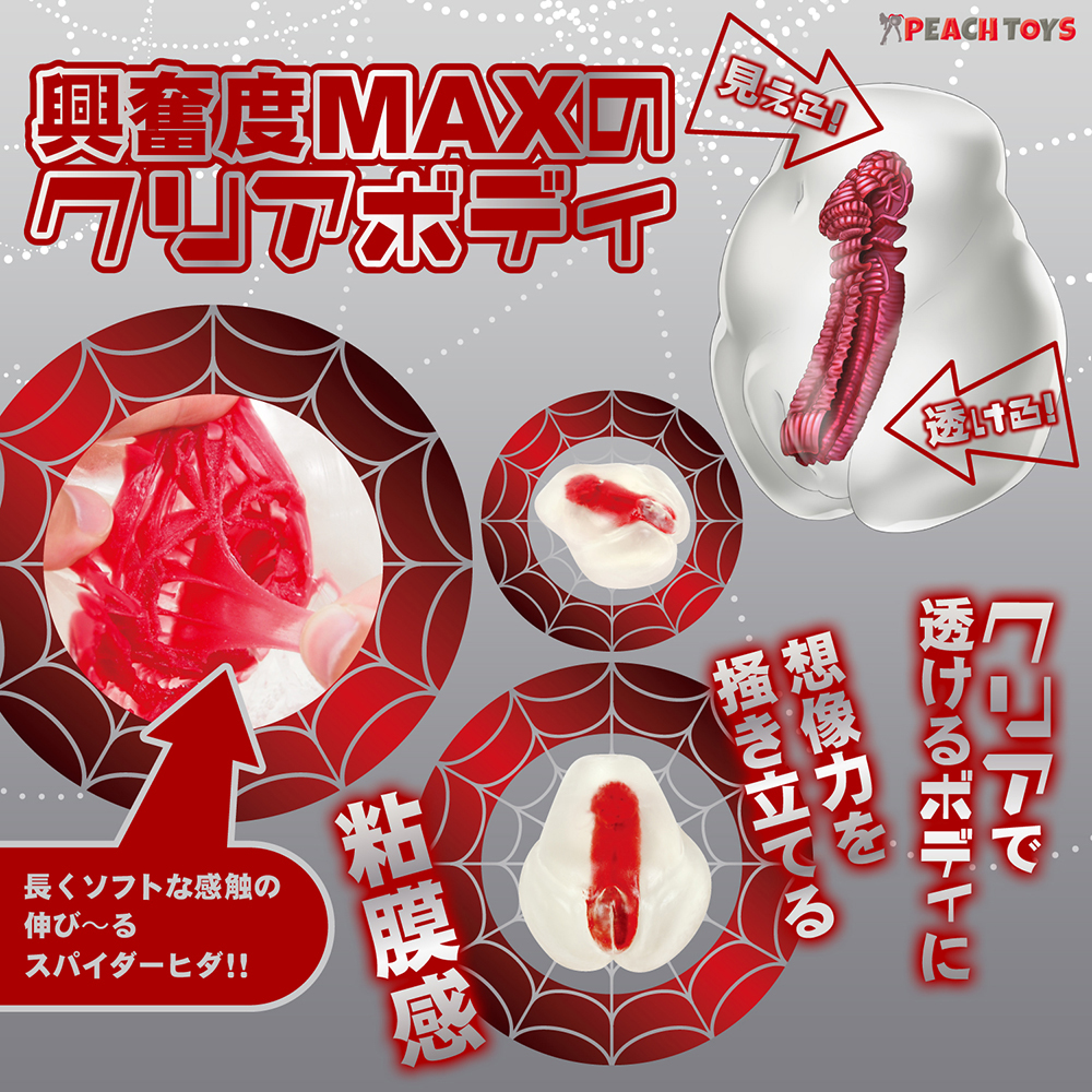 床オナ式名器シリーズに「スパイダーフィット」が登場!ワイドプレート構造と反りあがったフォルムでしっかりフィット。亀〇全体を包み込む横ヒダに、長い縦ヒダが絡みつき、ネット状のスパイダーヒダで縦横無尽に責め立てる!腰を少し動かすだけでもしっかり刺激!長期間S〇Xしてない蜘蛛の巣が張ったオンナノコの興奮を体験しよう!興奮度MAXのクリアボディ。スタンダードは内部が粘膜カラーの2層構造。硬さは標準。
