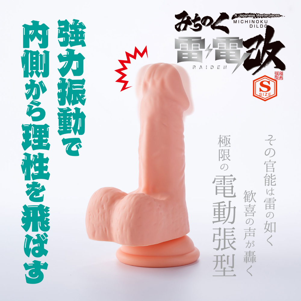 パワフルなスイング・ピストン・振動が人気の「みちのく雷電」。通常のみちのくサイズに変更し、より気軽に遊べる様になった「みちのく雷電改」の登場です。みちのく雷電改Sはシンプルさが自慢の先端振動モデル。ブルブルと心地よく震える、やや小さめサイズのディルドです。7パターンの先端振動はじわりじわりと響いてきます。じっくりほぐす様な、震える官能をお楽しみください。もちろんみちのくシリーズならではのリアルな造形は健在。肌触りの良いシリコン素材を採用し、滑らかで優しい感触に仕上がっています。便利な吸盤も付いているので、遊び方も自由自在です。本作では便利な充電式を採用し、2時間の充電で約60分のプレイが可能です。また防水機能(IPX7)を完備し、使用後は水洗いし清潔さを保つことができます。より遊びやすくなったみちのく雷電改。張型上級者をも満足させるこの品質をご堪能ください。