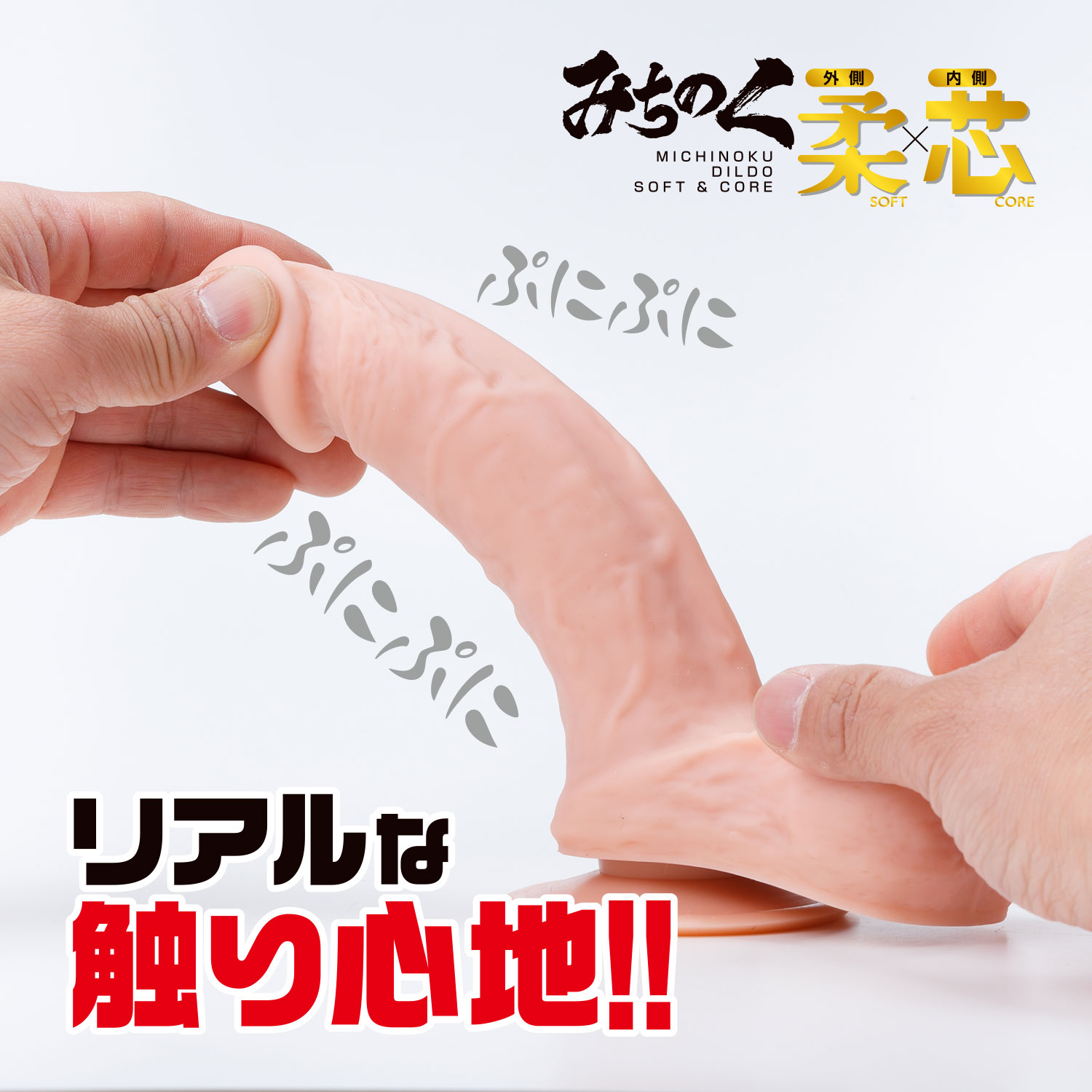 このみちのくディルド柔×芯"の最大の特徴は「外は柔らかく、中は硬い」二重構造です。今までとは異なる技術製法を駆使し、本物さながらの触り心地を実現しました。これにより外側(特に亀〇部分)はプニプニっとしたリアルな柔らかさを実現、リアル感溢れる弾力を手に入れました。また内側はまるで海〇体に血が通ったかの様な硬さの素材を使用、リアル過ぎる感触をお楽しみいただけます。今までのみちのくシリーズを超越した至極の使用感は、ディルドを愛する方にぜひ使っていただきたいと思います。このSサイズは小振りながら、しっかりとポイントを抑えた使いやすい一本。また今までのシリーズ同様に強力な吸盤は健在。壁面や床など、プレイに合わせた使い方でお楽しみいただけます。