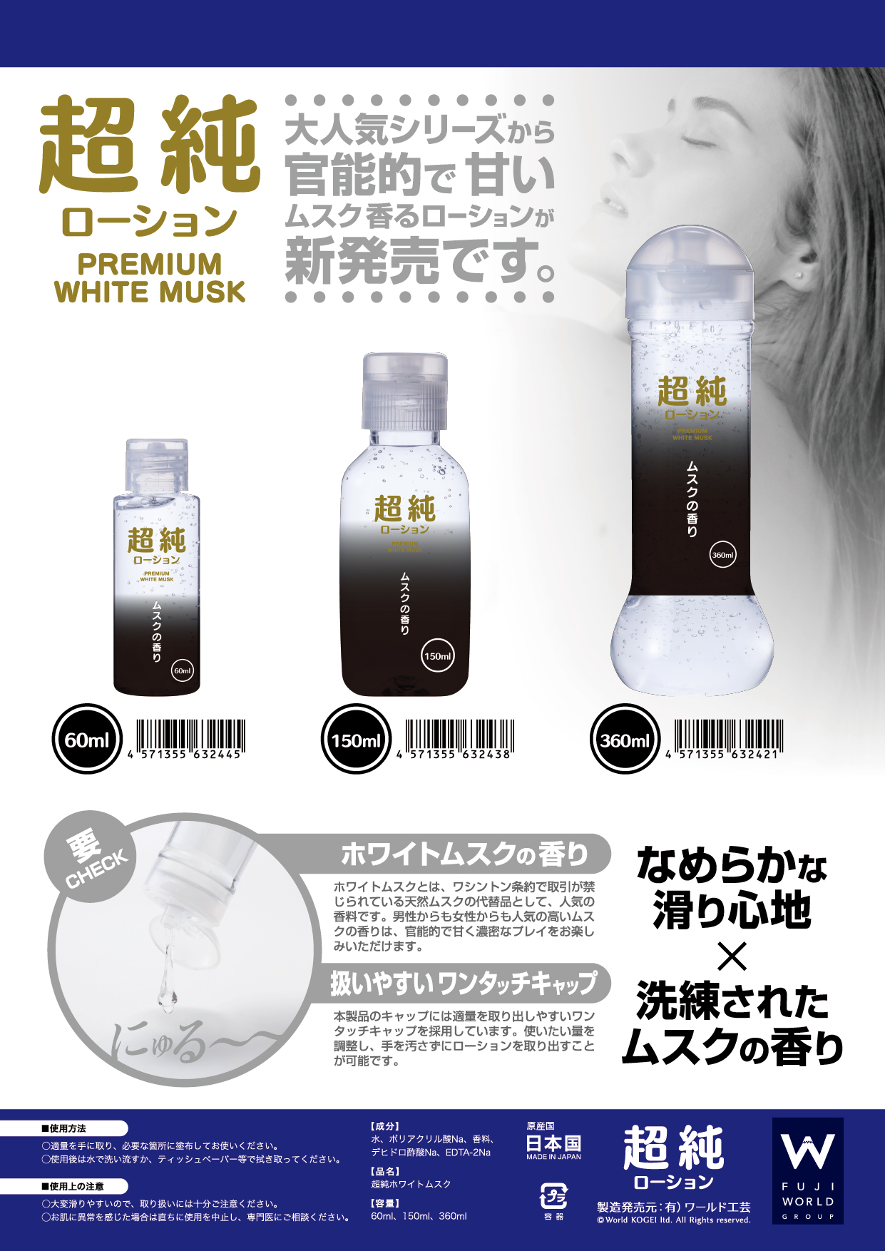 人気の超純シリーズに、官能的なホワイトムスクの香りのローションが登場です。なめらかな滑り心地で、様々なプレイスタイルに対応します。便利なワンタッチキャップを採用し、使いやすさも抜群です。ローション選びに迷ったら超純で間違いなし!