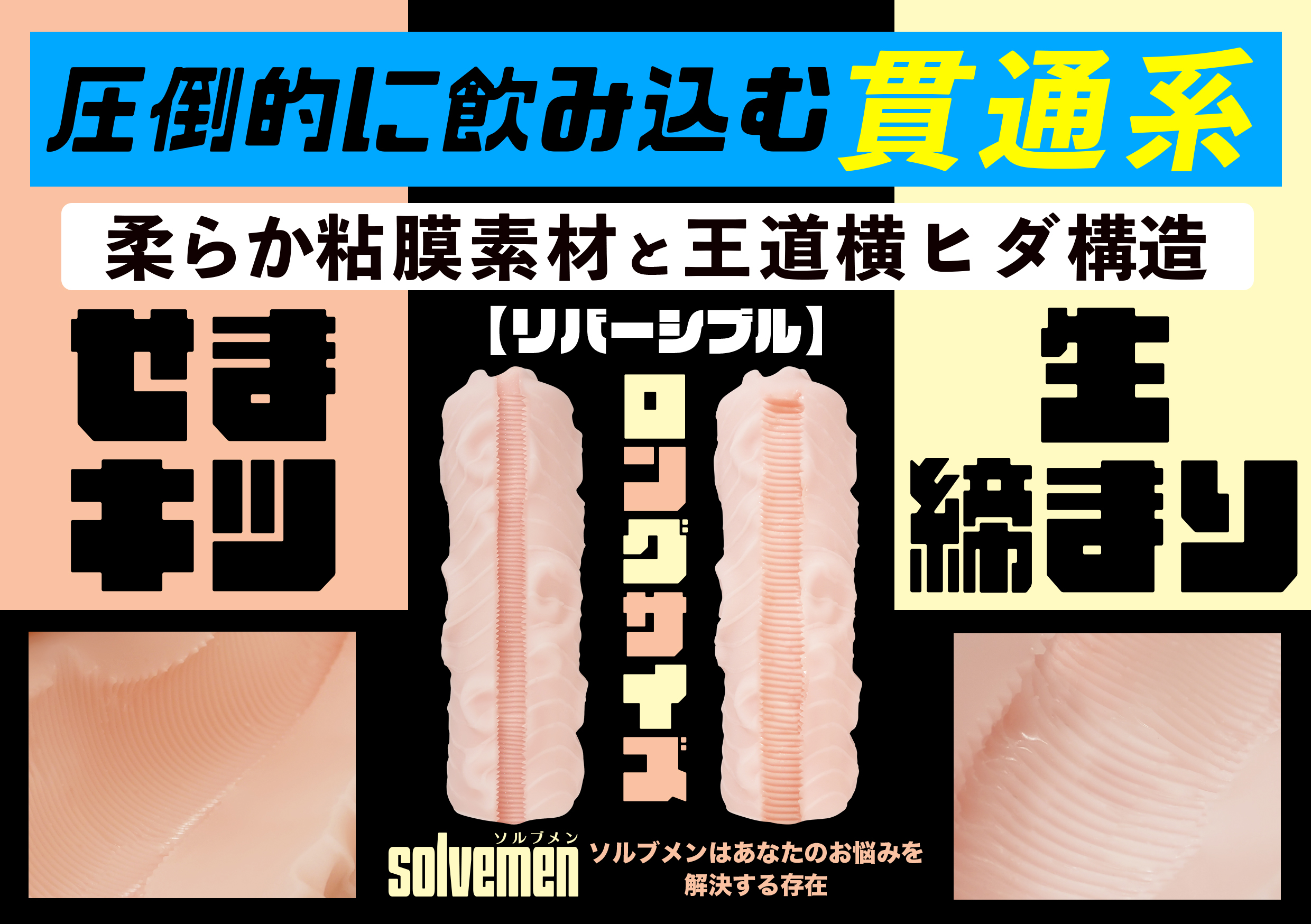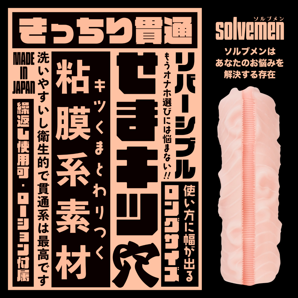 ソルブメンはあなたのお悩みを解決する存在です。「きっちり貫通」は今では珍しい貫通系となっております。洗いやすく衛生的で貫通系は最高です。使い方に幅が出るロングサイズ!キツくまとわりつく粘膜系素材を採用。もうオナホ選びには悩まない!!しかもまさかのリバーシブル仕様。裏返してもお使いになれます。あなたはオナホ選びに悩む必要はなくなります。あなたのためにソルブメンがいるのです。安心安全の日本製で繰り返し何度でも利用が可能です。