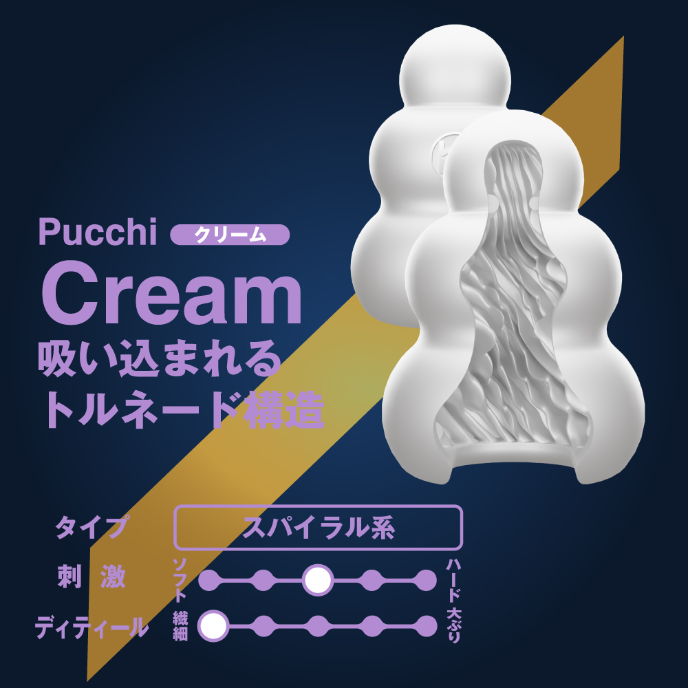 いつものプッチを贅沢に。プラスウェッチのねっとり感を増量し、プレミアムに仕上げました。従来のプッチから潤い成分「プラスウェッチ」を60%増量(当社比)しました。使用する軟性樹脂をより滑らかな肌触りの良いものへ昇華させ、まさにプレミアム品質に仕上げました。内部構造は全12種。王道の確かな刺激はプレミアム素材にぴったり。初心者から、通な方まで幅広く満足していただけます。クリーム:斜めに擦り上げてくるヒダはクリームのように昇りつめる絶頂感。