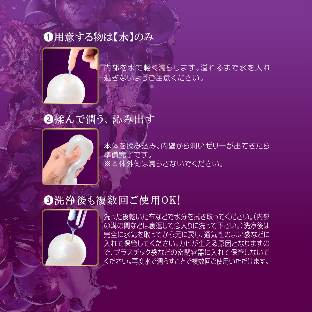 フィールシリーズから潤い成分が60%増量したプレミアムホールが誕生。縦に伸びるラインと豊かに膨らむ大ぶりのボールが特徴。従来品であるフィールシリーズから潤い成分が60%増量したプレミアムホール。締め付け感が楽しめる非貫通タイプ。ジューシーは縦に伸びるラインと豊かに膨らむ大ぶりのボール。触れるたびに、果肉が弾むような柔らかさと弾力が絶妙に調和した質感。予備ローション付き。