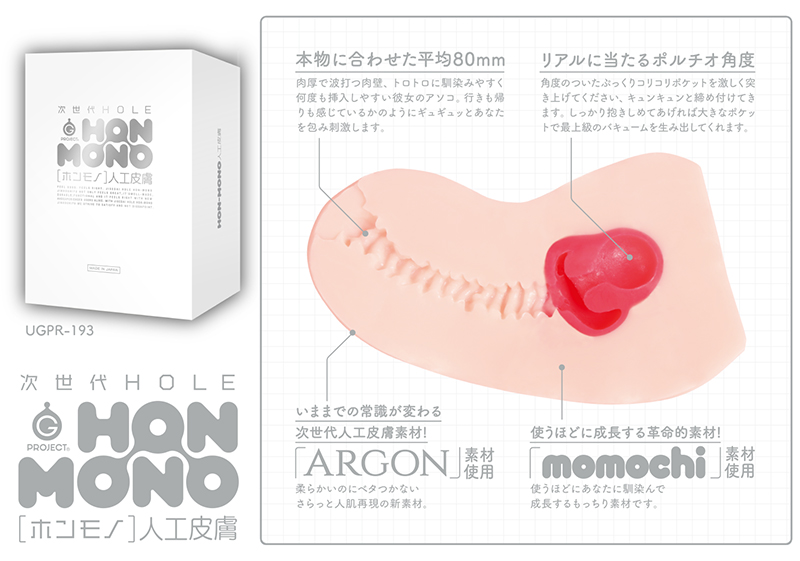 もうベトベトしない!!次世代のHOLE。いままでの常識が変わる次世代人工皮膚素材「ARGON(アルゴン)」を使って愛される女の子を再現しました。本物に近づけた平均サイズ、GスポットとAスポット、リアルに当たるポルチオ角度、波打つ肉壁、素材もこだわった「ふんわり柔肌とろける生感触」と柔らかいのにベタつかない人工皮膚素材による「サラサラ、すべすべ人肌感触」、非貫通ホールならではのバキューム性能で吸い付き、キュンキュン締め付けてくれる彼女をたくさん可愛がってください。直接肌に触れるものだから、国産素材&国内生産。