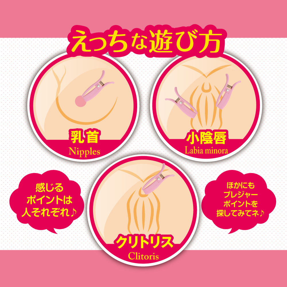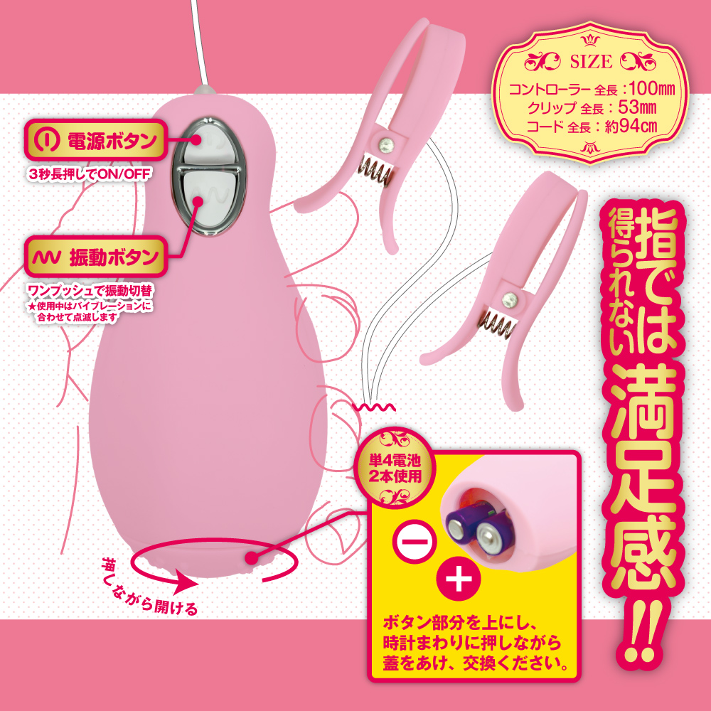 大きい乳首も挟めるバネ式クリップとプレイに集中できるワンプッシュで簡単操作のコントローラー。