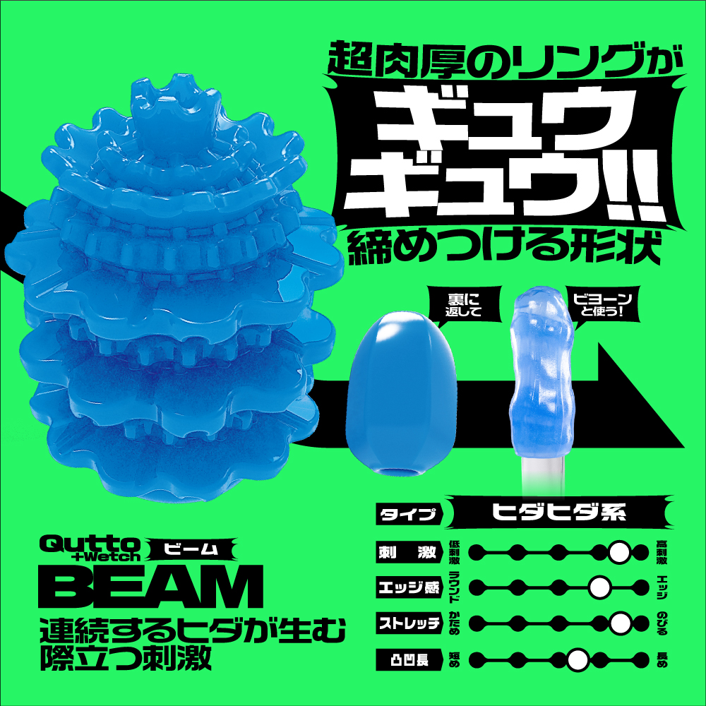 大粒デコボコ刺激がキュット締めつけ!裏返す事で未知なる体験と利便機能を持った変化する密集体ホール。「Qutto-キュット-」は、従来よりも大きく肉厚な突起を搭載。凹凸面を内側に返すことで、大粒の刺激が密集し、キュッと締めつけることで「未確認の触感」を楽しめます。さらに、素材は水と反応してぬめりを生む「プラスウェッチ」に進化。ローションなしで内部の構造をしっかり感じられます。ビームタイプは超肉厚リングが連なり、途切れなく刺激を加え続けます。予備用ローションも付属しており、好みに応じて使い分けが可能です。