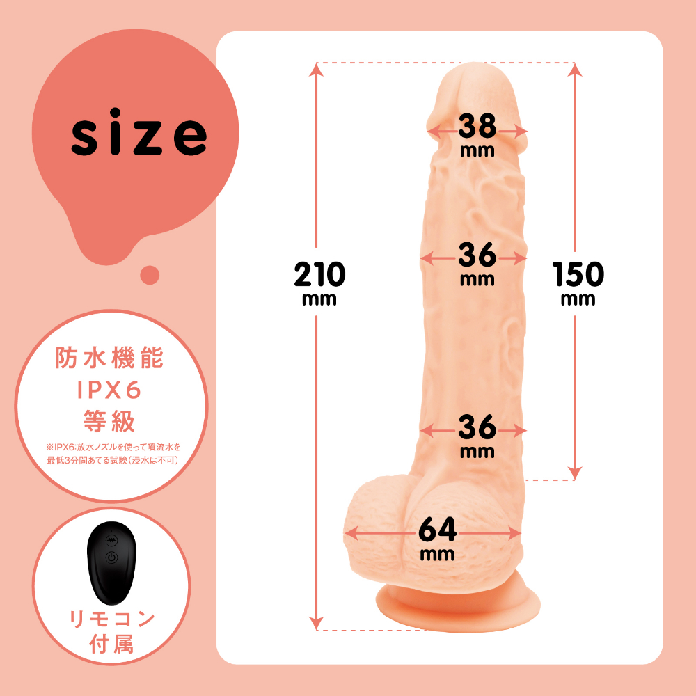 生棒感覚で超奥イキ!!突きながらかき乱す、ナマの絶頂快感が楽しめる電動ディルドです♪生々しい弾力と触り心地のぷにぷに肉棒!奥の気持ちいいとこを深突きするずんずんピストンギミックは肉壁を挟み込む心配がない安心設計。肉壁を気持ちよく擦りあげるぐるぐるビーズスピンギミックで敏感ゾーンを極み責め!吸盤でしっかり固定が可能なので普段味わえない向きからの責められ感も堪能できます!肌ざわりなめらかな高品質ソフトシリコン仕様です。本体は充電式なのでエコに使用可能。自分好みの刺激をリモコン操作で簡単に堪能できます。※本体:充電時間約150分※本体:最大連続稼働時間約100分(初期振動パターン未変更時)_IPX6等級_ピストン&ビーズスピン:8パターン振動_付属品:電池式リモコン、USBフォーンプラグ式充電ケーブル※IPX6:放水ノズルを使って噴流水を最低3分間あてる試験(浸水は不可となります)