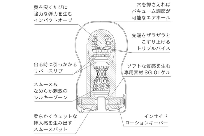 ソフトに配合された軟質素材により、ソフトな弾力に包まれながらの、ねっとり絡みついてくる先端刺激を実現しました。優しく吸いつくバキュームはそのままに、絡みついてくる奥突き感をお楽しみください。