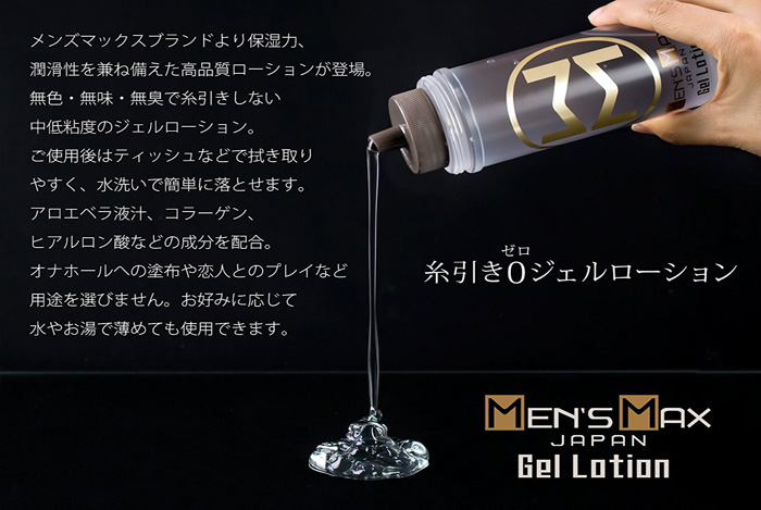黒いバックに金のロゴが浮かぶ印象的なパッケージデザイン。メンズマックスローションにジェルタイプが登場!!高い潤滑力でありながら糸引きしない、無色・無味・無臭の中低粘度高品質ローションです。アロエベラ液汁、コラーゲン、ヒアルロン酸などの成分を配合。皮膚にうるおいを与えて、柔軟性を保ち、肌を滑らかにする効果が期待できます。ご使用後はティッシュなどでも拭き取りやすく、水洗いで簡単に落とせるのでオナホールの使用に最適です。