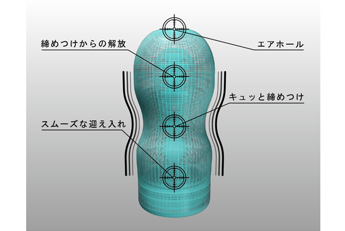 高弾力ゲルと内部ディテールによる強烈な刺激を、高級ウレタンが程よく緩和することで、ただキツいだけではない、極上のしめつけを生み出します。