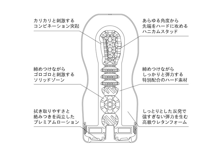 新たに設計された内部ディテール、高弾力に特別配合されたゲル、しっとりと包み込む高級ウレタンフォーム、拭き取りやすいプレミアムローション、その全てが高品質。