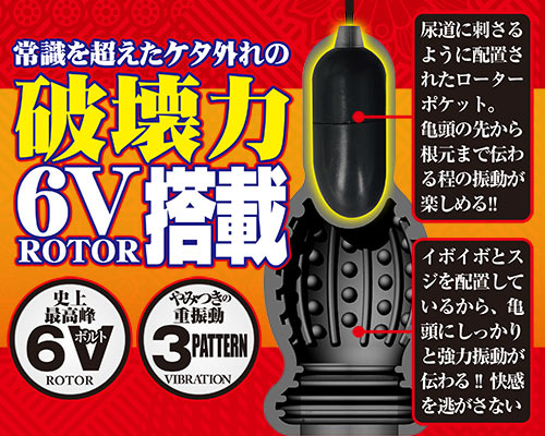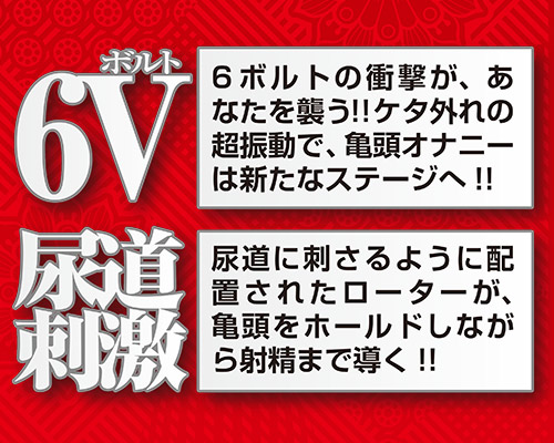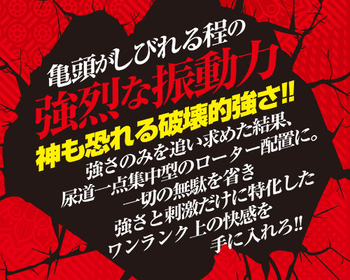 シリーズ初の6ボルトローターを搭載したことにより、ブラックロックの名に恥じない、質の良い濃厚な射精感を堪能可能。キャップは尿道に突き刺さるような形状になっているので、脳天から強烈な快感が突き抜けていくような深い刺激を楽しめる。
