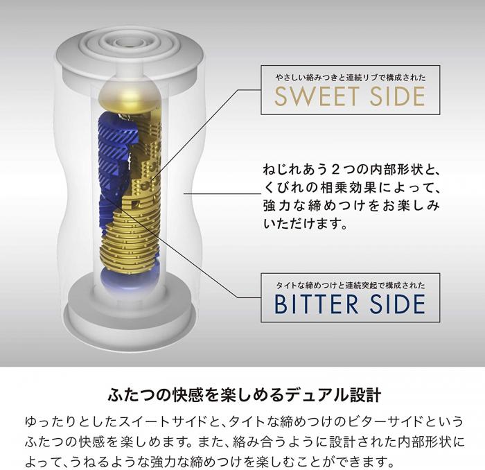 ぎゅっと締めつける『ビターサイド』と、優しく絡みつく『スイートサイド』という、ふたつの異なる刺激を1本で楽しむことができます。