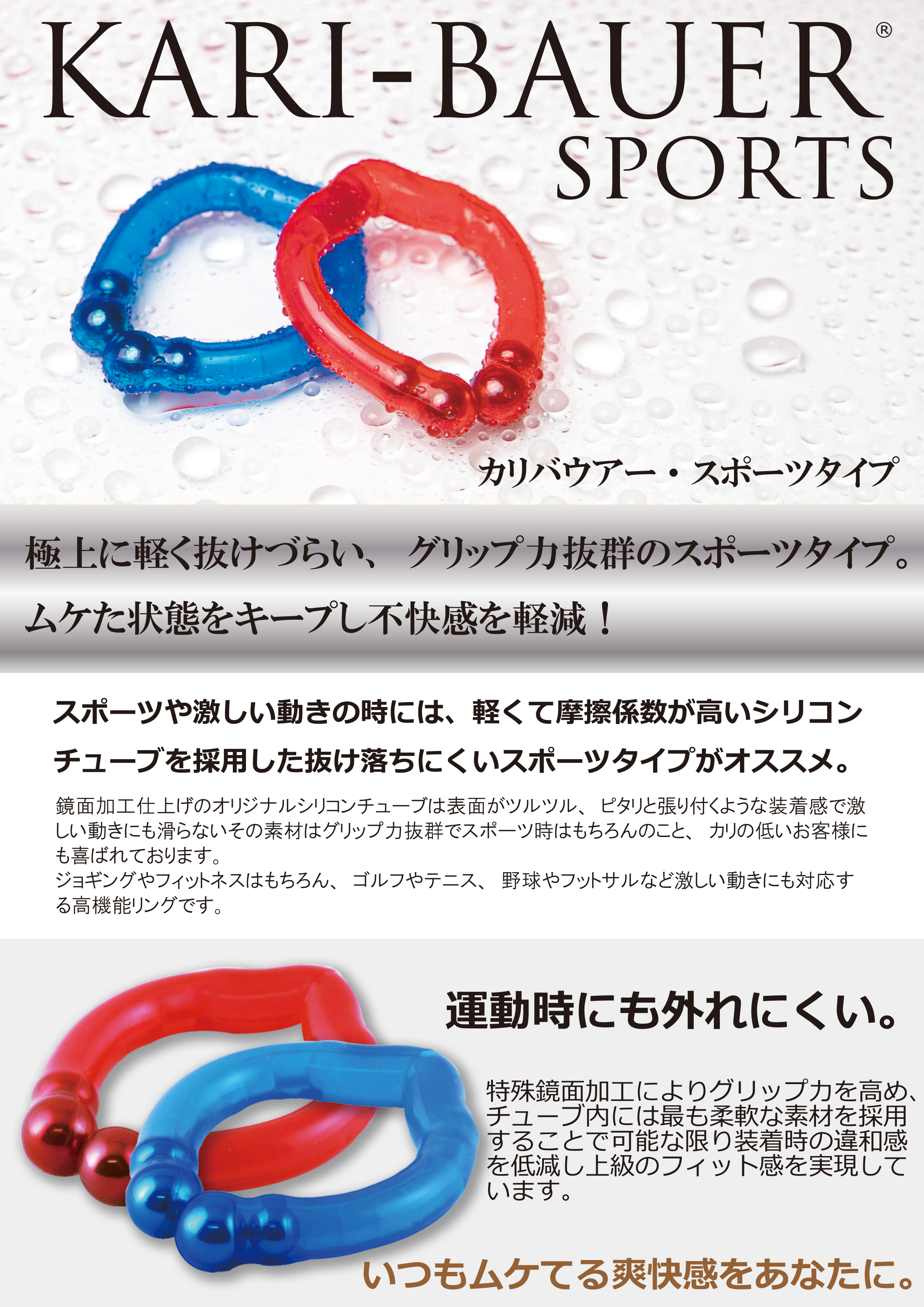 不潔になりがちな仮性包茎の男性をサポートするメンズアクセサリーカリバウアーのスポーツタイプ。スポーツや激しい動きの時にも対応する軽くて摩擦係数が高いシリコンチューブを採用した抜け落ちにくい高機能リングです。
