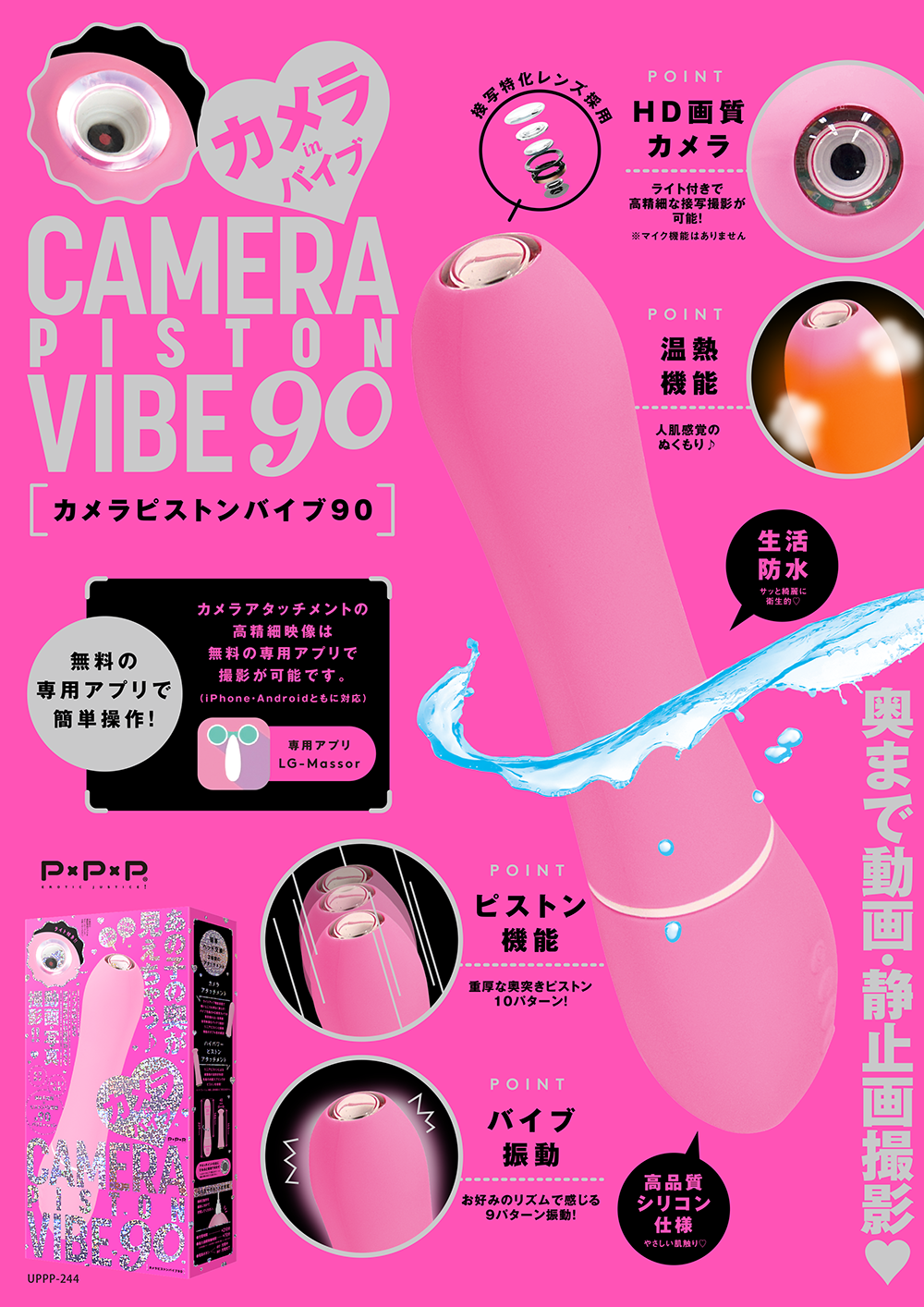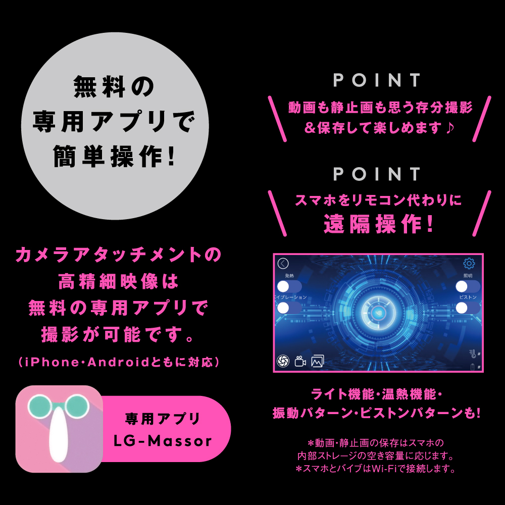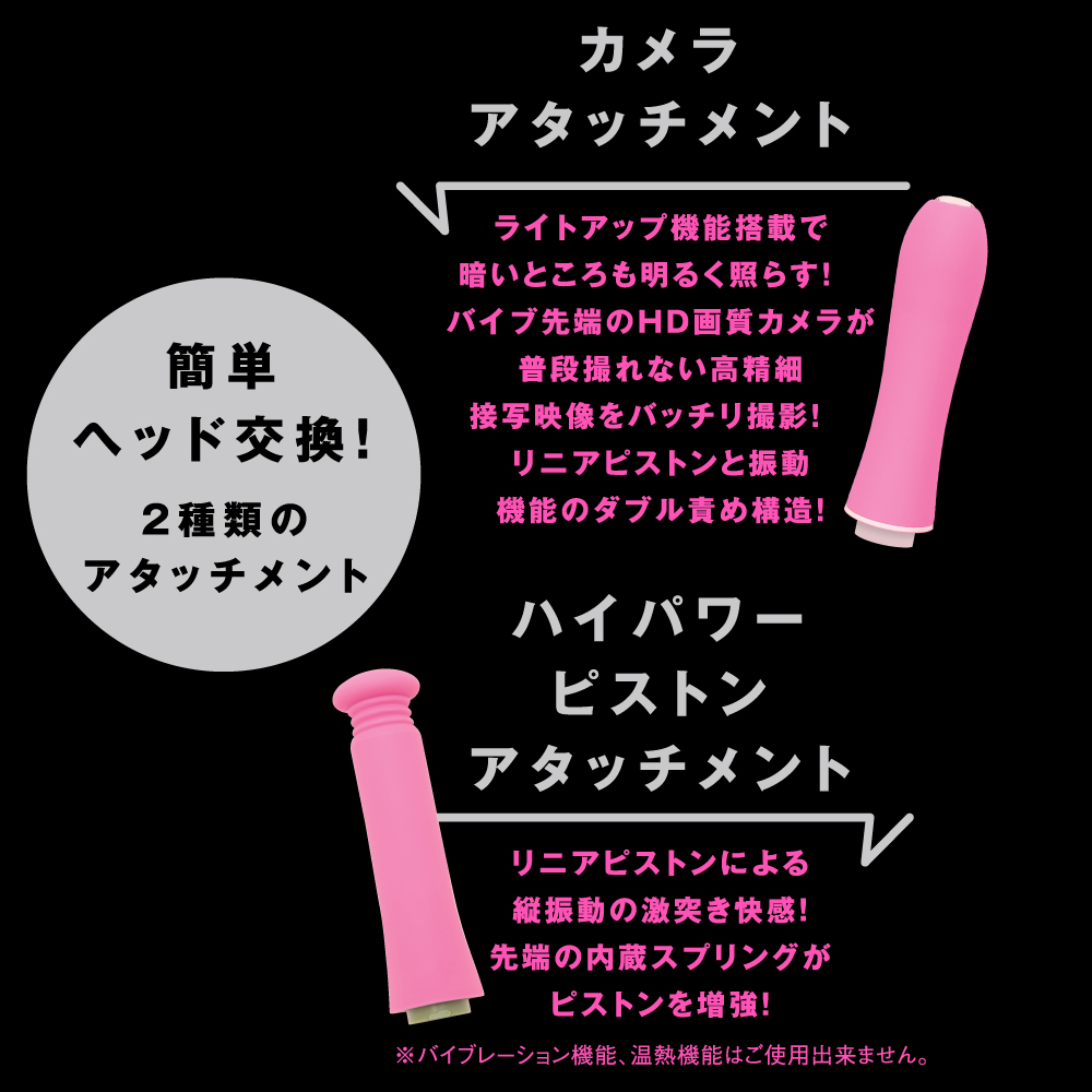 ★アノ娘の奥が見えちゃう♪ バイブ先端のHD画質カメラによる動画・写真の接写撮影!! ライトアップ機能搭載で暗いところも明るく照らします! リニア振動による重厚な奥突きピストン10パターン! お好みのリズムで感じる9パターンのバイブ振動! 高品質シリコン仕様でやさしい肌触り♪ 温熱機能搭載で人肌感覚のぬくもり。 2種類のアタッチメントで簡単ヘッド交換、飽きのない充実機能。カメラアタッチメントはカメラ機能に限らずリニアピストンと振動機能のダブル責め構造!ハイパワーピストンアタッチメントはリニアピストンによる縦振動の激突き快感、先端の内蔵スプリングがピストンを増強! 本体は充電式なのでエコに使用可能。※本体:充電時間約210分※本体:最大連続稼働時間約70分(初期振動パターン未変更時)_生活防水_付属品:アタッチメント_USBプラグ式充電コード ※マイク機能はありません。※カメラ機能は無料の撮影専用アプリをダウンロードしてお楽しみください。