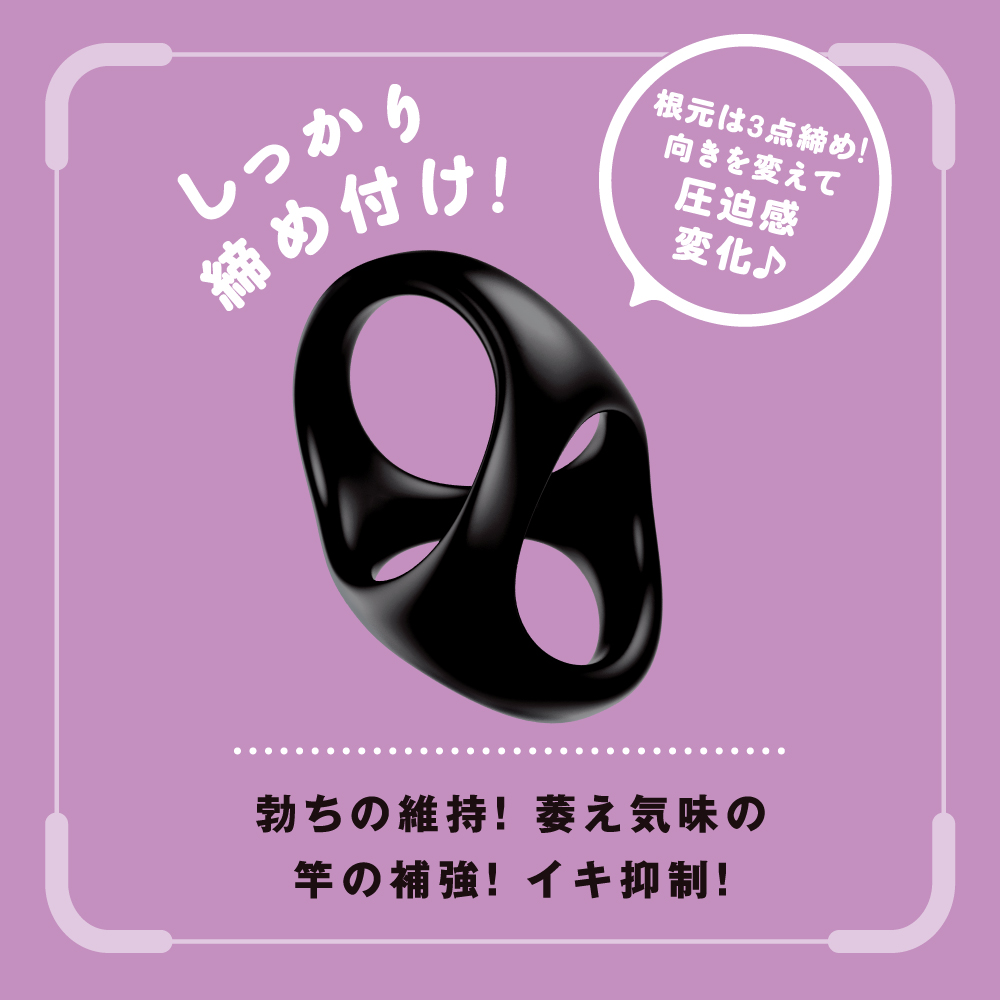 超!ぷにっとりんぐから、根元&タマタマに装着が出来るリングが登場。根元を3点で締め付け!タマタマを下から突き上げるようにしっかり締め付けてチカラを出す!サッと装着♪ピタッと密着!装着しやすい伸縮性、臭いのない高品質シリコンで根元をしっかり締め付け、着けてるストレスを軽減!すべすべ装着感で毛の巻き込みを緩和。向きを変えて圧迫感も変化♪ 自分好みの締め付けで勃ちの維持!萎え気味の竿の補強!イキ抑制!ハードな締めつけでドバーっと出る感UP♪きゅーっと超極楽発射!