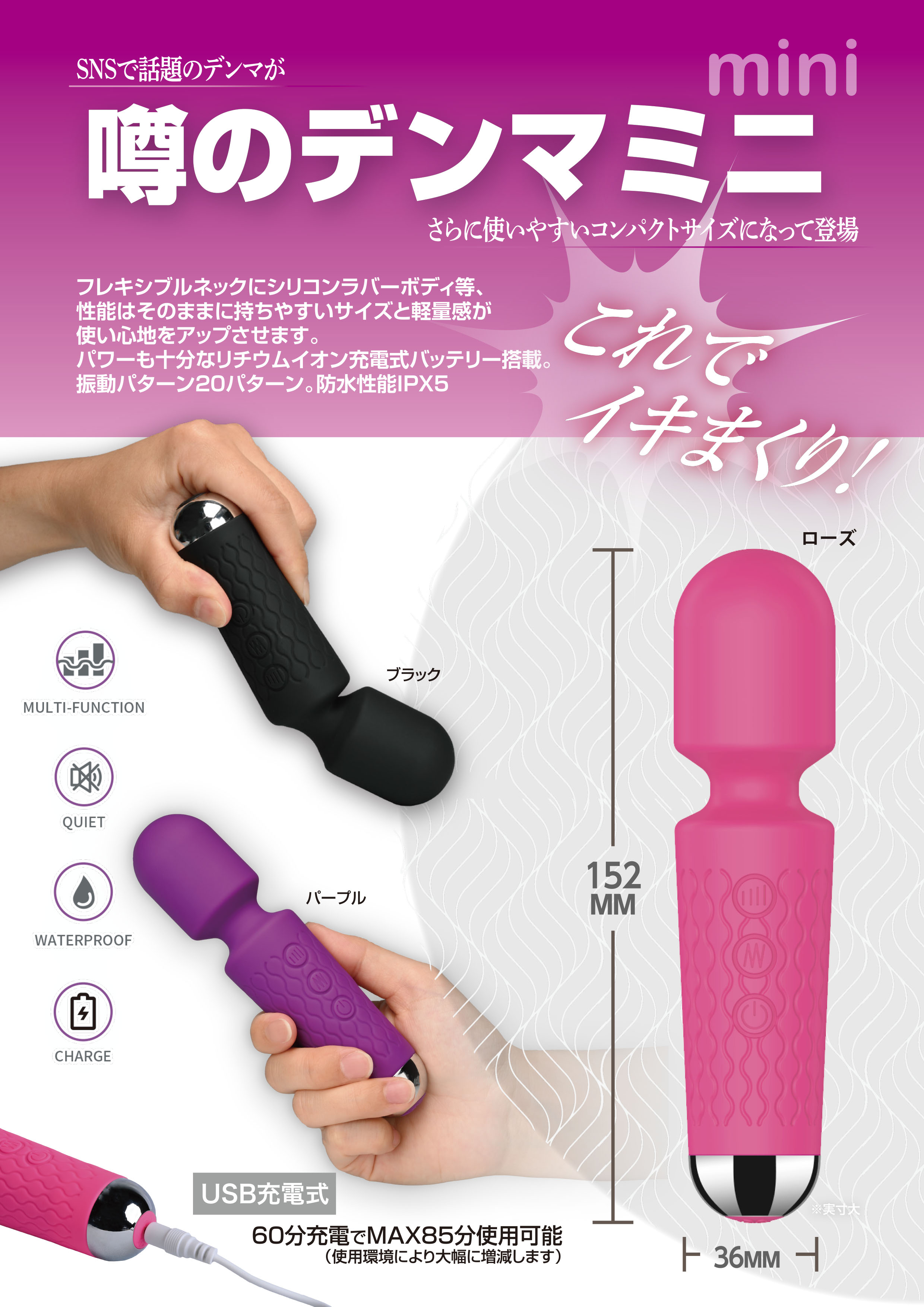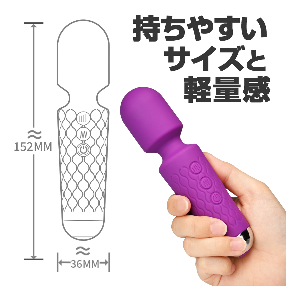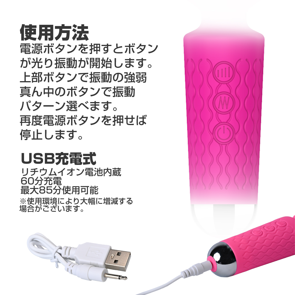 よく観る動画で使われていたり、SNSで話題のデンマがさらに使いやすいコンパクトサイズになって登場!フレキシブルネックにシリコンラバーボディ等、性能はそのままに持ちやすいサイズと軽量感が使い心地をアップさせます。パワーも十分なリチウムイオン充電式バッテリー搭載。60分充電で最大85分使用可能。(使用環境により大幅に増減します)振動パターン20パターン。防水性能IPX5