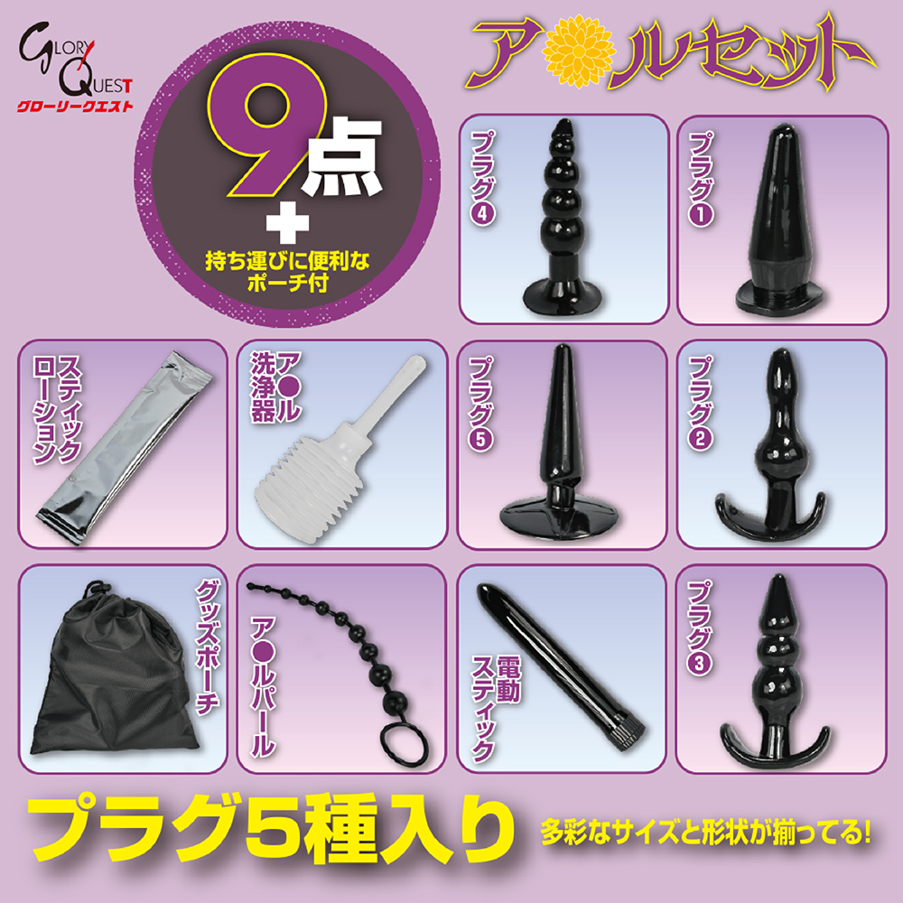 これさえ買えば全部揃ってる!初心者からベテランまで大満足の究極のア○ルプレイグッズ9点セット+持ち運びに便利なポーチ付き!洗浄器からローション、その日の気分や体調に合わせたプラグ5点、さらに電動ア○ルスティックとア○ルパールでいつでも気軽に最高のア○ルプレイを楽しめます!