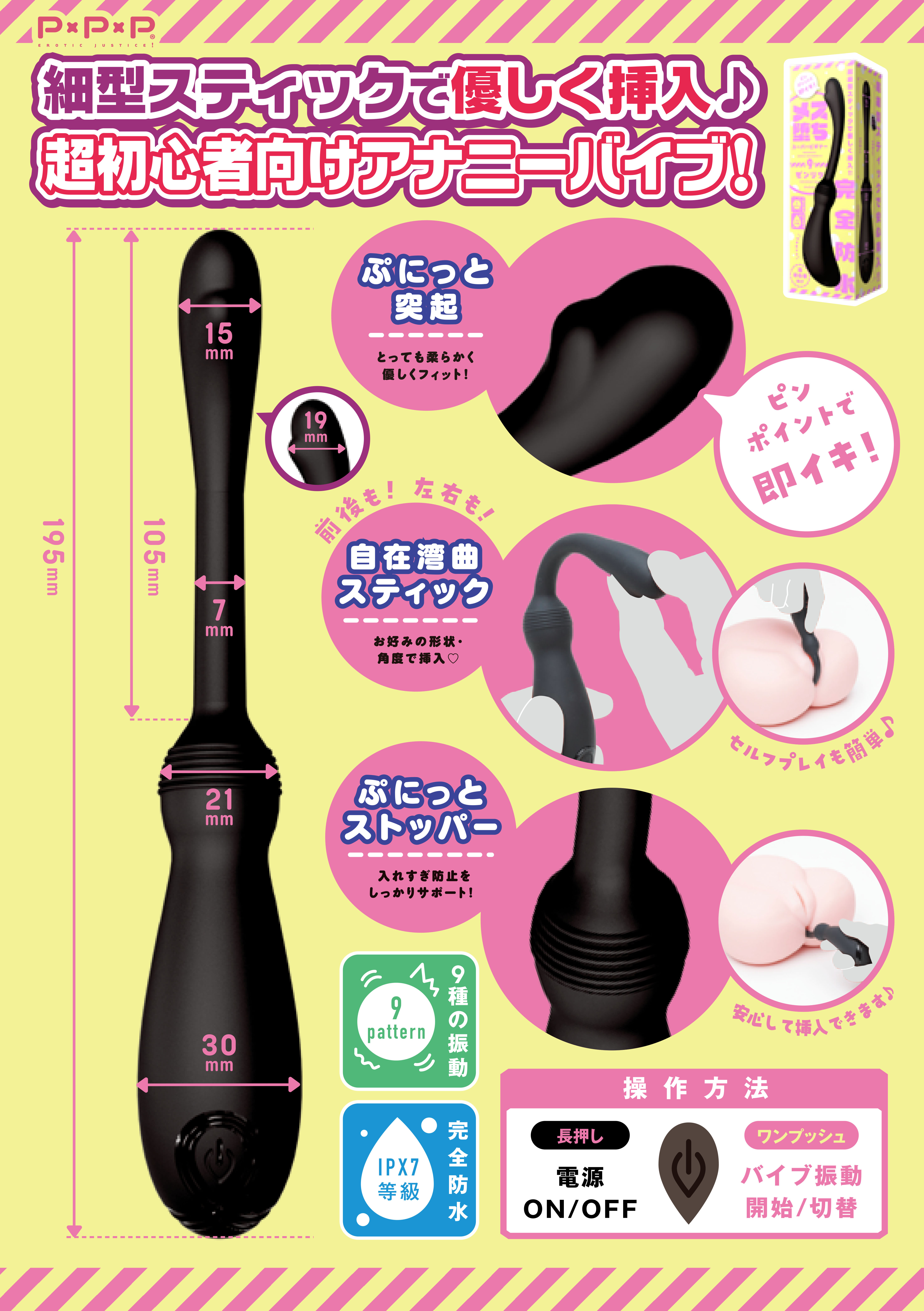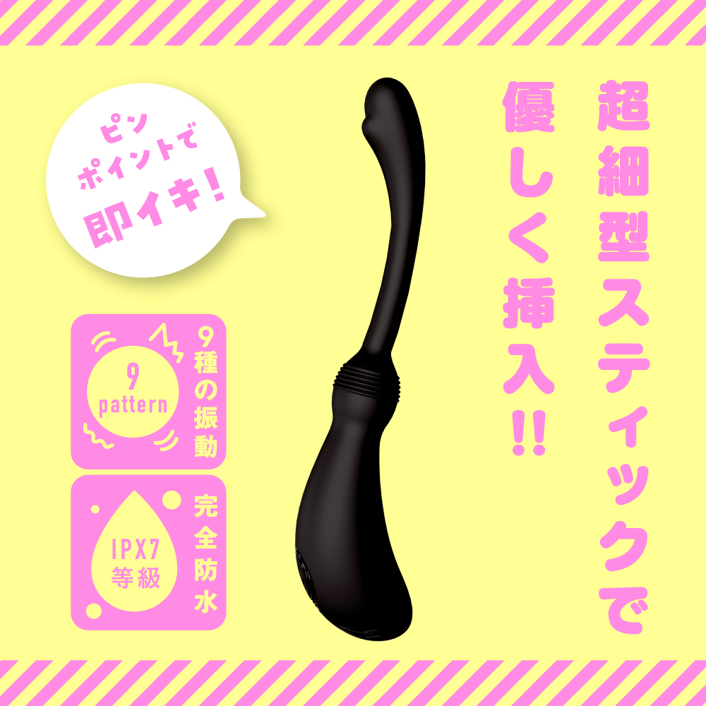★超細型スティックで優しく挿入&ピンポイントで即イキ!!★PPPより超初心者にオススメなアナニーバイブが登場!高品質ソフトシリコン&ツルンと簡単挿入フォルムの超細型スティックで安心して挿入ができる!!先端のぷにっと突起はとっても柔らかく優しくフィット!自在湾曲スティックでお好みの形状・角度で挿入♪ぷにっとストッパーが入れすぎ防止をしっかりサポート! セルフプレイも簡単で超玄人の即イキにも便利っ!★女の子みたいにイケるメス堕ちイキ仕様の優秀バイブ!本体は充電式なのでエコに使用可能。※本体:充電時間約100分※本体:最大連続稼働時間約90分(初期振動パターン未変更時)_IPX7等級_9パターン振動_付属品:USBマグネット式充電ケーブル