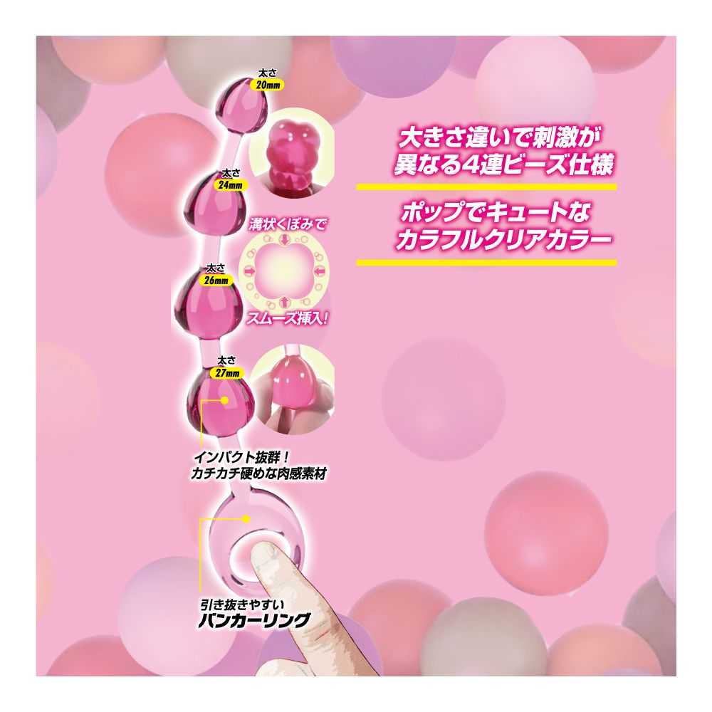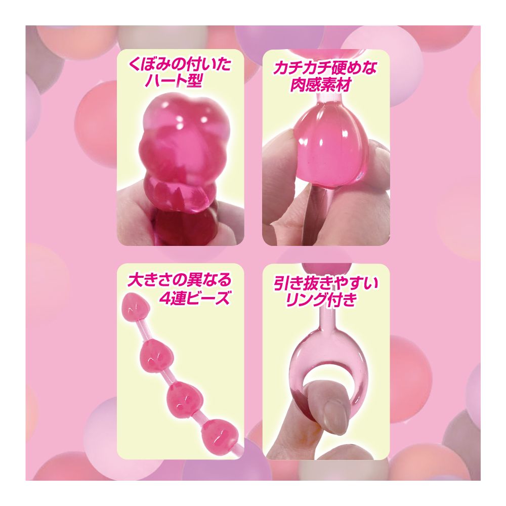 ポップでキュートなミニサイズのア●ルビーズが新登場!かわいいハート形状が、大きさ順に4つ連なるア●ルビーズです。先端から20ミリ、24ミリ、26ミリ、27ミリと奥に行くほど太くなるので、快感のステップを楽しめます。さらに、本体形状として縦縞くぼみがあり、空気や液体の通り道となり挿入心地をサポート。最奥部は引っ張りやすい輪っか付き。ビギナーの方にもぴったりな4連モデルで、スケルトンでカラフルなボディカラーが抵抗感を低減させます。本体素材には、カチカチ硬めなエラストマー素材で、インパクトのある肉感を再現しました。この硬さが、強い存在感を放ちます。あなたを夢中にさせる快感素材と、ビギナーにもオススメできるベーシックな型状で、狙いを外さない鉄板のア●ルビーズです。