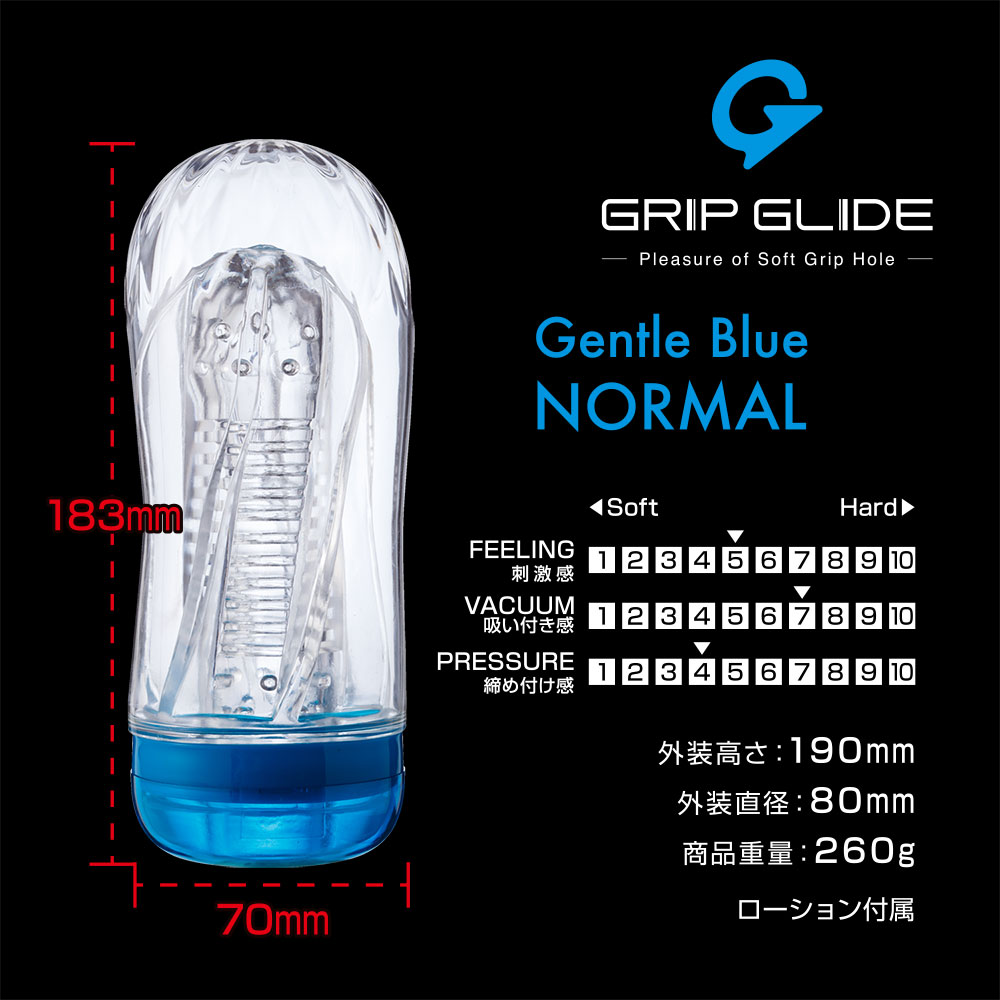 握れるカップホール!!本製品は外側に柔らかな素材を使用し、今までのカップホールにはなかった独特の握り心地を実現しました。これによりカップホールの欠点でもあった圧力調整が可能となり、好みの締め付け具合によるプレイがお楽しみいただけます。また握ることによりカップ内部の空気圧が変化し、吸引力が上昇、新時代のバキューム感を体感できます。また、ホール本体にクリアケースを採用し、ヴィジュアル的な美しさはもちろんのこと、内部が透けて見えることによって興奮をもたらす視覚効果の兼ね備えています。■本製品は使用後に水洗浄することで、繰り返しお使いいただけます。■本製品は嫌なにおい・ベタつきをカットした素材を使用しています。【ジェントルブルー】はリアル感触が宿る圧倒的多幸感程よい刺激感でリアルな感触No.1(ノーマルタイプ)
