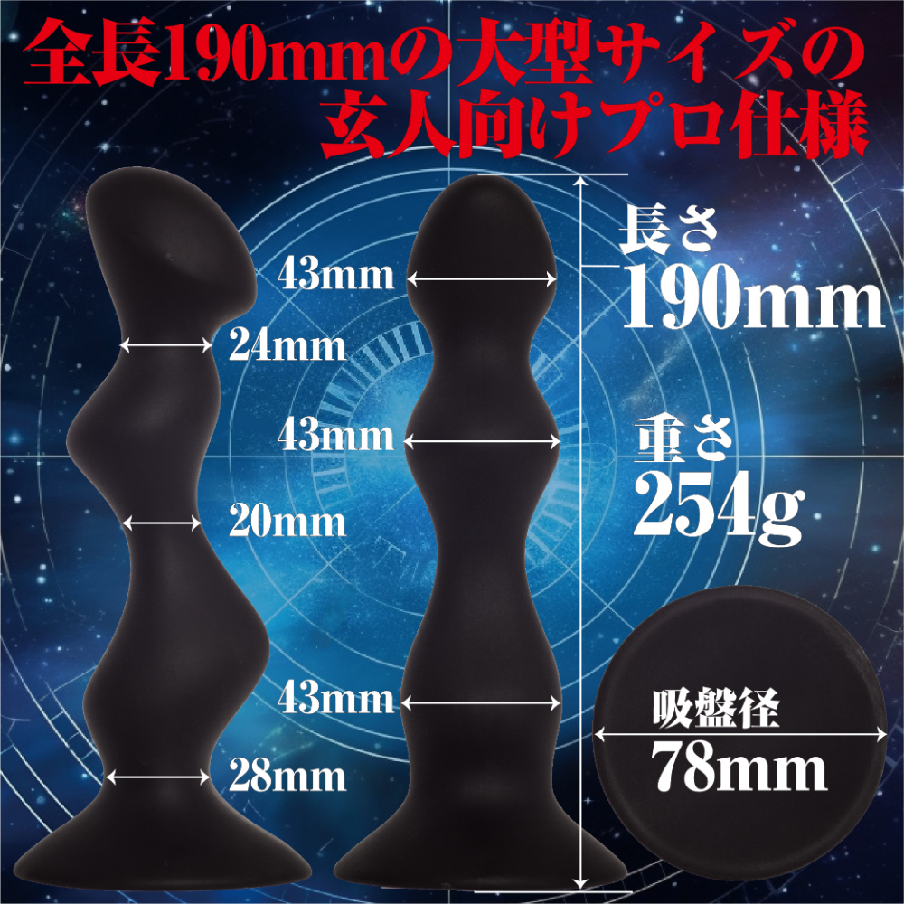 快感ボール内蔵の高品質シリコン製のア●ルディルドの登場です。全長190mmの大型サイズで玄人向けのプロ仕様です。表面は高級シリコンのすべすべの肌触りで、内部には小刻みに動く「快感ボール」が3つ内蔵されており、運動時の小刻みな刺激で新感覚を味わえます。3段階のふくらみが圧迫感をしっかりと演出。圧倒的サイズ感で他の追随を許しません。ア●ル開発!前●腺開発!ドライオーガズム!パートナーと!外出のお供に!などいろいろな使い方が出来ます。特にお散歩は内部の快感ボールが振動し、新しい楽しみ方ができることでしょう。表面の高品質シリコンはすべすべの肌触りで気持ちよさを感じる質感になってます。強力吸盤の台座付きで床、壁などに貼り付けてハンズフリーで様々な楽しみを実現できます。※本商品はジョークグッズですので、その他の目的でご使用された場合の責任は一切負いません。