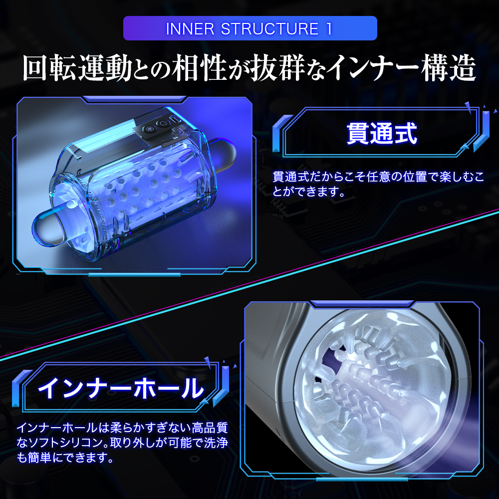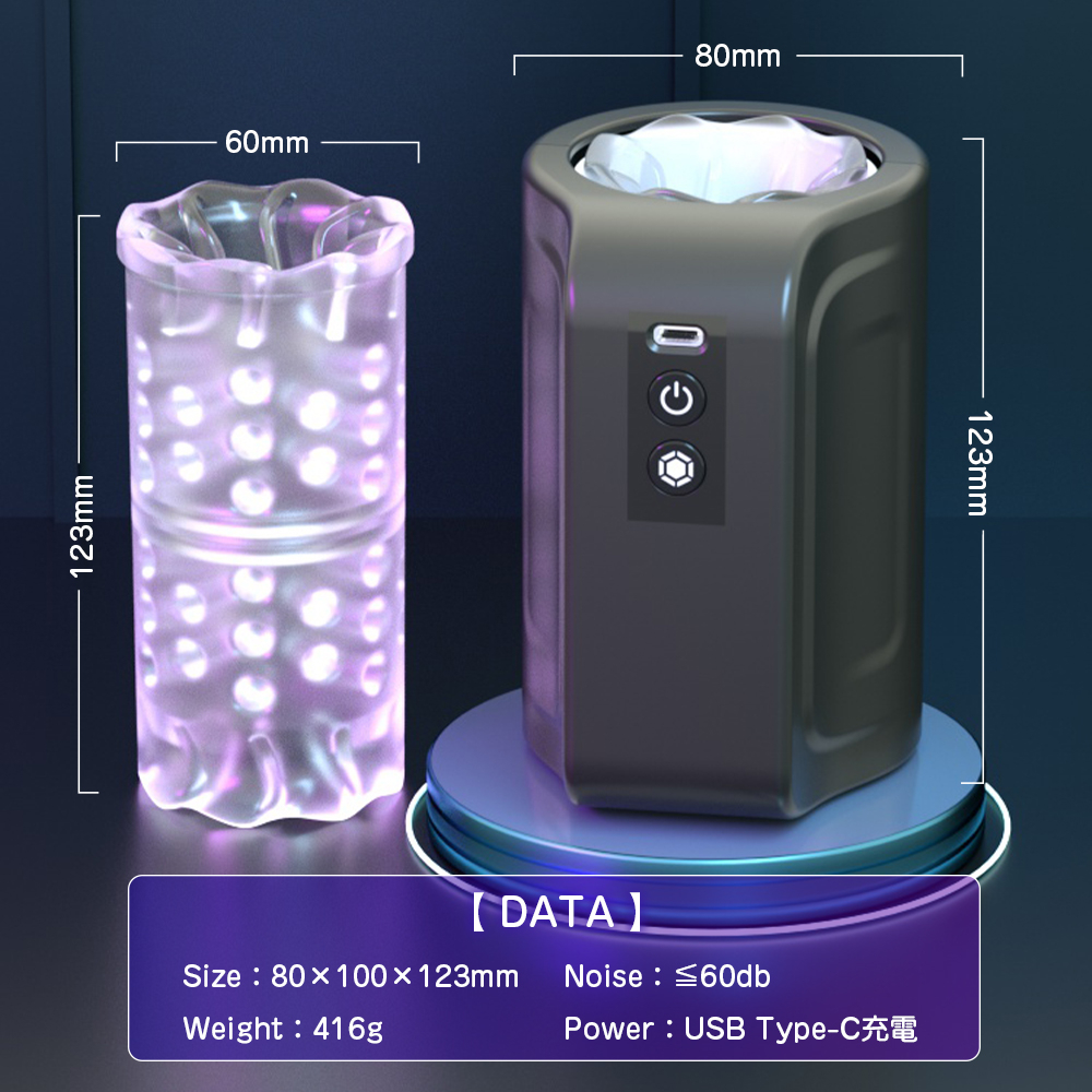 超軽量ボディ(416g)+止まらない強力トルク回転。極限まで軽量化、小サイズ設計。【自動回転(7パターン)+手動ピストン】が片手で快適に楽しめます。ボタンは2つ。電源ON/OFF、パターン切り替え。動作中、電源ボタンを素早く2回押すことで緊急停止ができます。IPX6相当の防水機能付きなのでインナーホールは本体と一緒に洗浄できます。また、インナーホールは取り外し可能です。お気に入りのmyオナホが装着可能ですが内部を圧迫しすぎると本体に負荷がかかり、動作しない場合があります。【内容物】本体、ご利用ガイド、USBType-Cケーブル【サイズ】80mm×100mm×123mm【重量】416g【可動時間】80分【充電時間】3時間