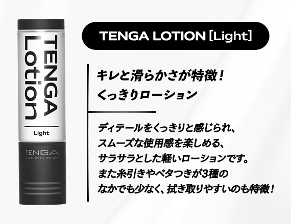 異なる3つの快感。専用設計のTENGA LOTION!TENGA LOTIONは、繰り返し使用するTENGA製品専用に配合されたローションです。内部ディテール全体に塗りやすい、ロングノズル仕様。さらに、ローション吐出時に糸引きしない、ワンウェイバルブを採用しました。ディテールをくっきりと感じられ、スムーズな使用感を楽しめる、サラサラとした軽いローションです。また、糸引きやベタつきが少なく、拭き取りやすいのも特徴です。
