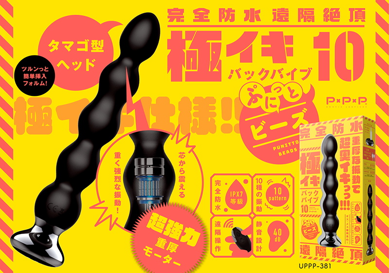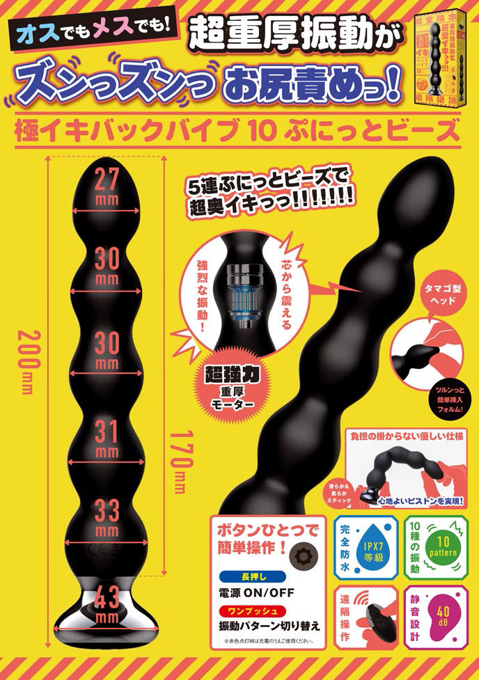 重い振動が5連のビーズにずっしり伝わる極イキバイブ!!★PPPより男女兼用のバック用ビーズバイブが登場。超振動深感!!超奥イキっ!タマゴ型ヘッドはツルンっと簡単挿入フォルム!5連ぷにっとビーズでぷにぷに弾力と心地よい密着&出し入れ快感♪超強力重厚モーターで芯から震える重くて強烈な振動!高品質ソフトシリコンでカラダに負荷のかからない優しい仕様の滑らか&柔らかスティック★極イキ仕様の優秀バイブでもっと新しい快感を見つけてくださいね!本体は充電式なのでエコに使用可能。完全防水で浸水も気にならずお手入れ簡単!絶頂を手元でコントロールできるリモコン付き!※本体:充電時間約90分(供給電力量によって変わります)※本体:最大連続稼働時間約50分(初期振動パターン未変更時)_完全防水のIPX7等級_10パターン振動_付属品:電池式リモコン_USBマグネット式充電ケーブル