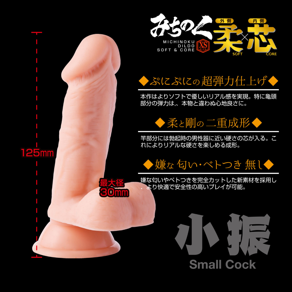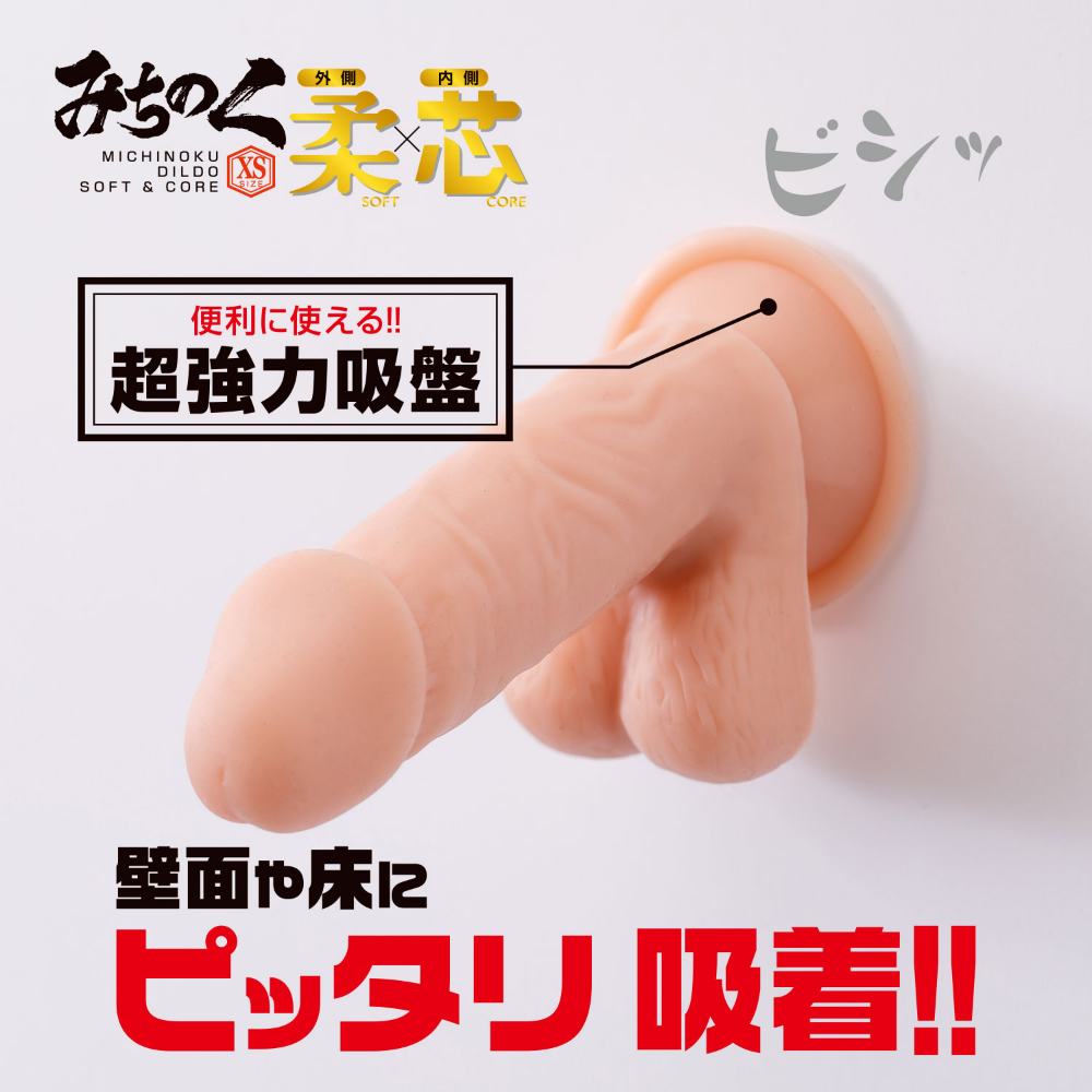 世界中で売れ続けている大人気ディルド・みちのくシリーズ。人気の柔芯シリーズに新たなラインナップが登場です。このみちのくディルド柔×芯"の最大の特徴は「外は柔らかく、中は硬い」二重構造です。今までとは異なる技術製法を駆使し、本物さながらの触り心地を実現しました。これにより外側(特にキトー部分)はプニプニっとしたリアルな柔らかさを実現、リアル感溢れる弾力を手に入れました。また内側はまるで海〇体に血が通ったかの様な硬さの素材を使用、リアル過ぎる感触をお楽しみいただけます。今までのみちのくシリーズを超越した至極の使用感は、ディルドを愛する方にぜひ使っていただきたいと思います。このXSサイズはやや小振りなサイズ感、それでもしっかりとツボを押さえた一本です。また今までのシリーズ同様に強力な吸盤は健在。壁面や床など、プレイに合わせた使い方でお楽しみいただけます。