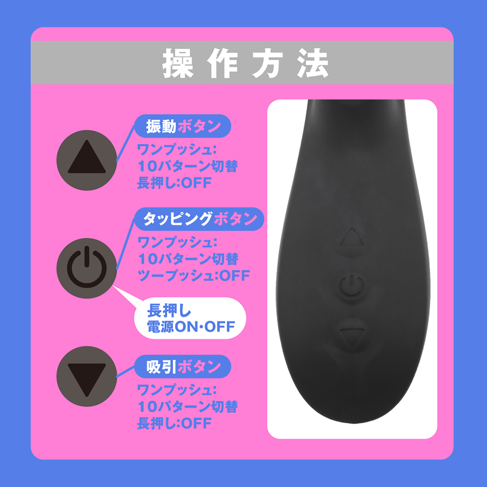 1台3イキ_奥・Gスポ・クリを同時責めできる欲張りバイブ!曲がった形状が奥にぴったりフィット!重振動で奥イキ開発!Gスポをトントンと刺激する高速タッピング機能はまるで手マンされているかのような極上快感!激しく吸い上げるバキューム吸引&クリをツンツン刺激する舌付き!震えて叩いて吸って 3in1!気持ちいいトコロを全部責められる快感天国を体験してください_※本体:充電時間約120分※本体:最大連続稼働時間約50分(初期振動パターン未変更時)_防水機能IPX6等級_付属品:USBマグネット式充電ケーブル※IPX6:放水ノズルを使って噴流水を最低3分間あてる試験(浸水は不可となります)
