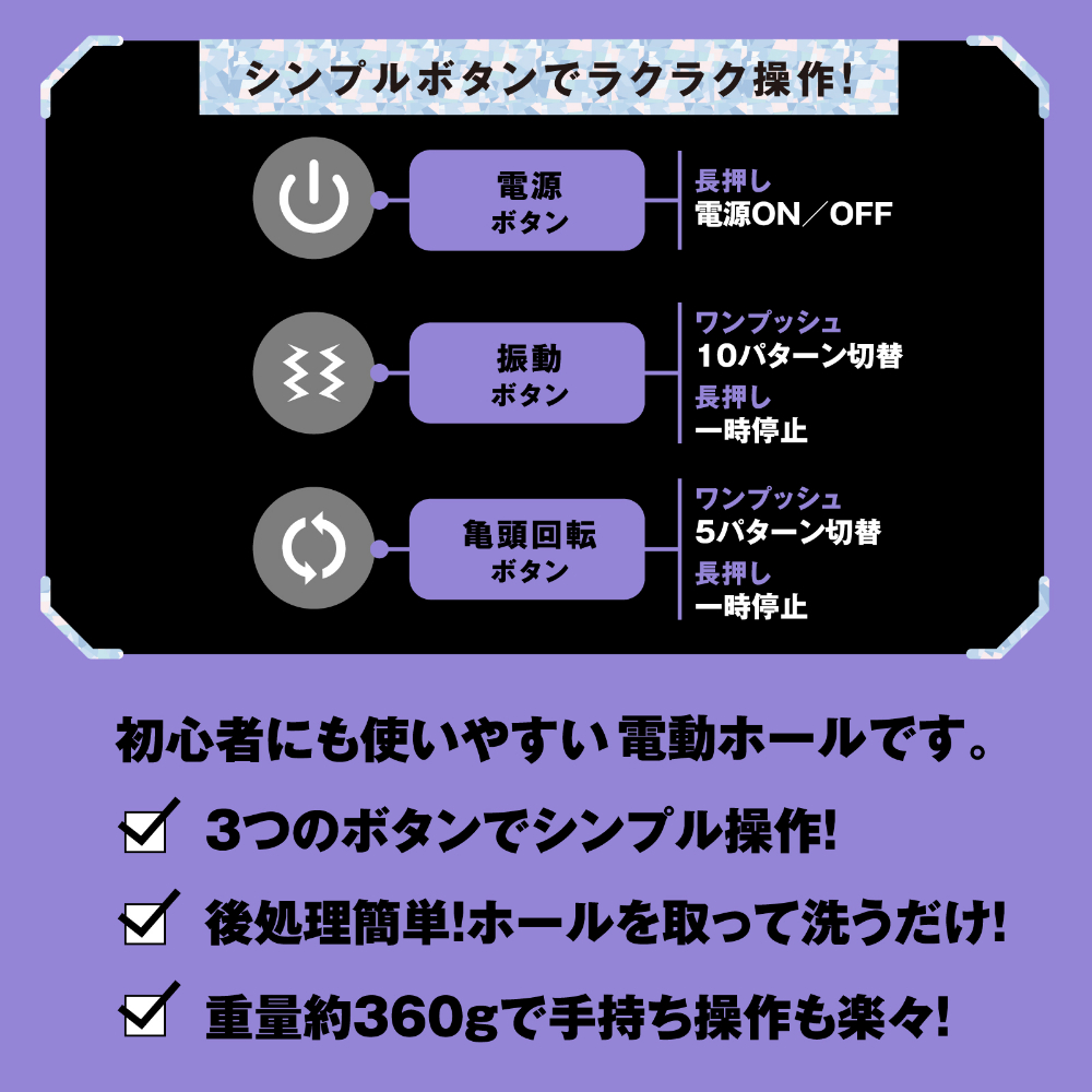 亀頭回転パワフル振動のハイクオリティ電動オナホが登場!一番敏感な亀頭に回転5パターン!竿部分には芯まで震えるヘビー級振動10パターン!全50バリエーション!異なる性感帯に最適な刺激を与える快感コンビネーション!高性能モーター搭載によりパワフルなのに静かな回転振動を実現しました。稼働音を気にせずプレイに集中できます。初心者にも使いやすい電動ホールです。シンプルな3つボタンで片手でも操作が可能です。インナーホールを取って洗うだけなので、後処理も超簡単です。重量約360gで手持ち操作も楽々です。直接肌に触れるものだから、安全性と感触にこだわり高品質なエラストマーを使用しています。伸縮性抜群の柔らか素材が吸い付きながら絡みつく粘膜刺激!もっちり柔らか人肌感触の挿入口はリアルを超えた幸福快感!竿部分をダイレクトに刺激する360°ビラビライボの敏感刺激!最先端技術によりコンパクトなのにパワフル&多機能!インナーホールにもこだわった電動ホールです!静音設計 ≦60dB。充電用USBケーブル付属。