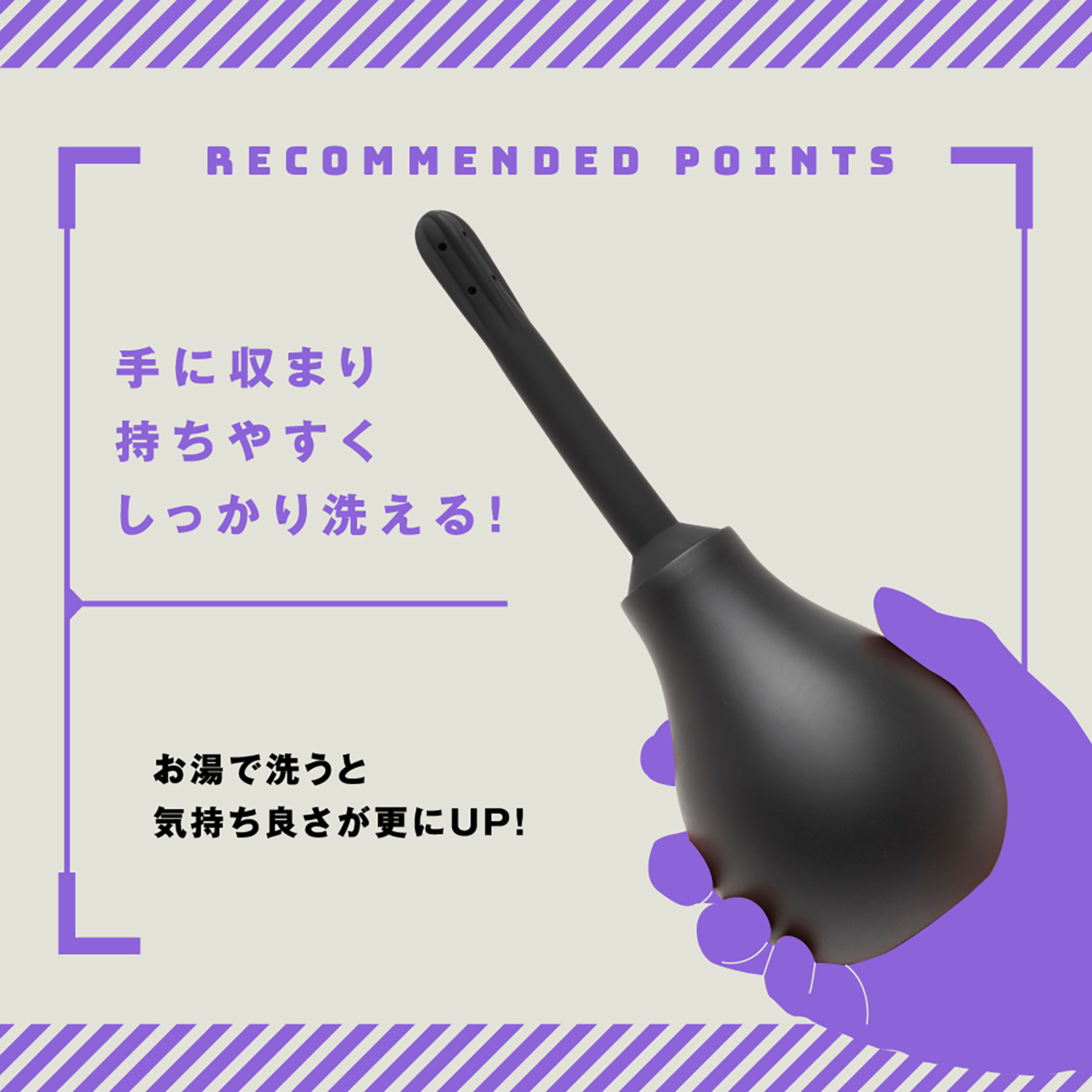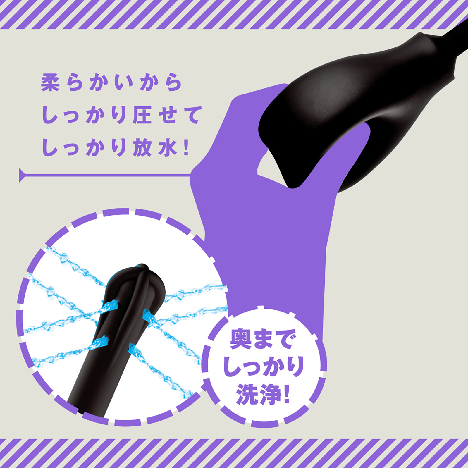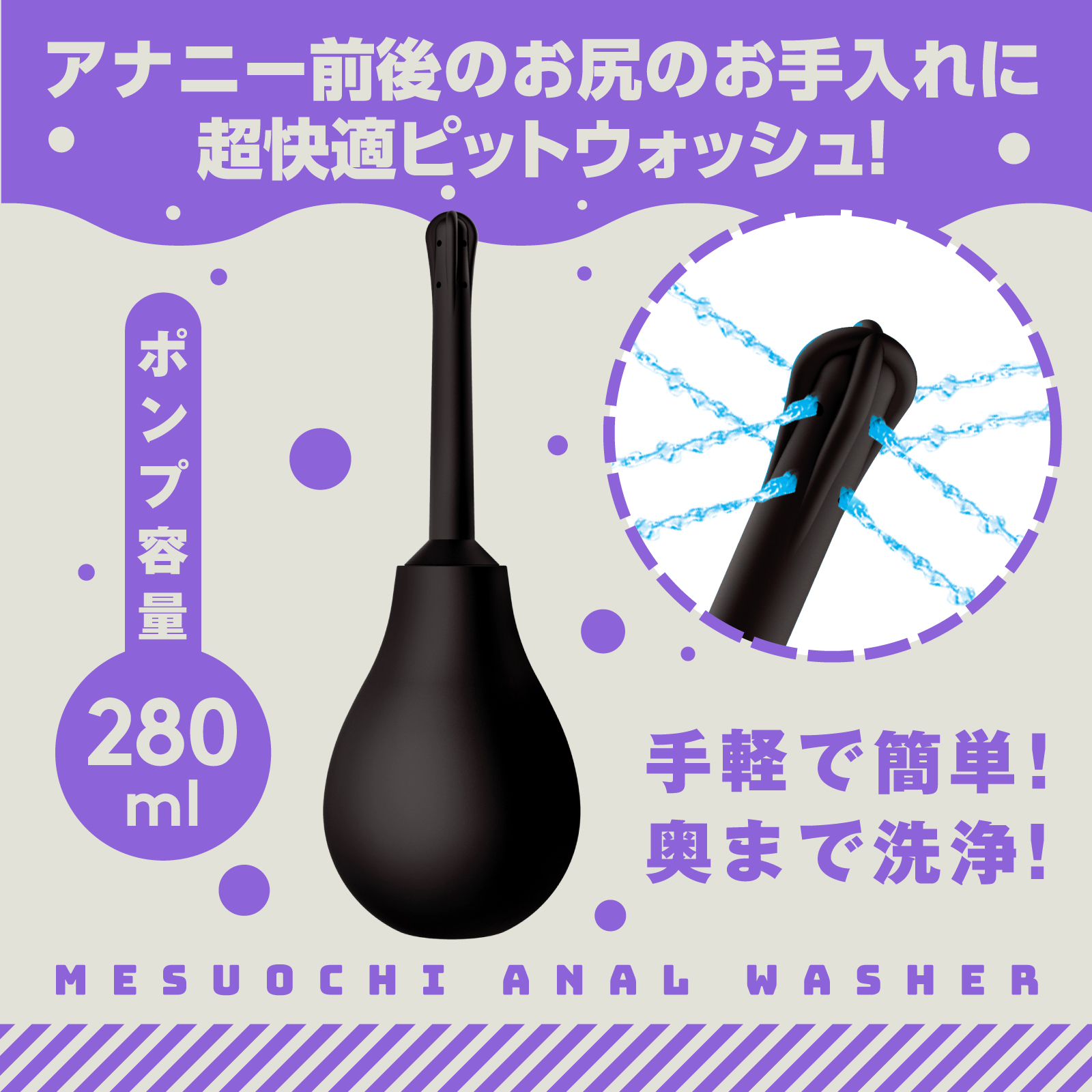 手軽で簡単!奥までしっかり洗浄!メス堕ちアナニーのその前・その後に超快適にピットウォッシュできるアナルウォッシャーです。先端部分の8穴から4方向に水流放射して、気になる汚れをすみずみ洗浄♪ツルンと簡単に挿入できるフォルムの細長ソフトノズル。高品質ソフトシリコンなので柔らかい安心仕様です。ポンプ容量は280mlで手に収まり持ちやすくしっかり洗えます!お湯で洗うと気持ち良さが更にUP♪ポンプも柔らかいのでしっかり圧せてしっかり放水が可能。汚水が入らない逆流防止設計で使用後の洗浄も簡単・衛生的です。ノズルを外してコンパクトに収納できるので保管も便利!