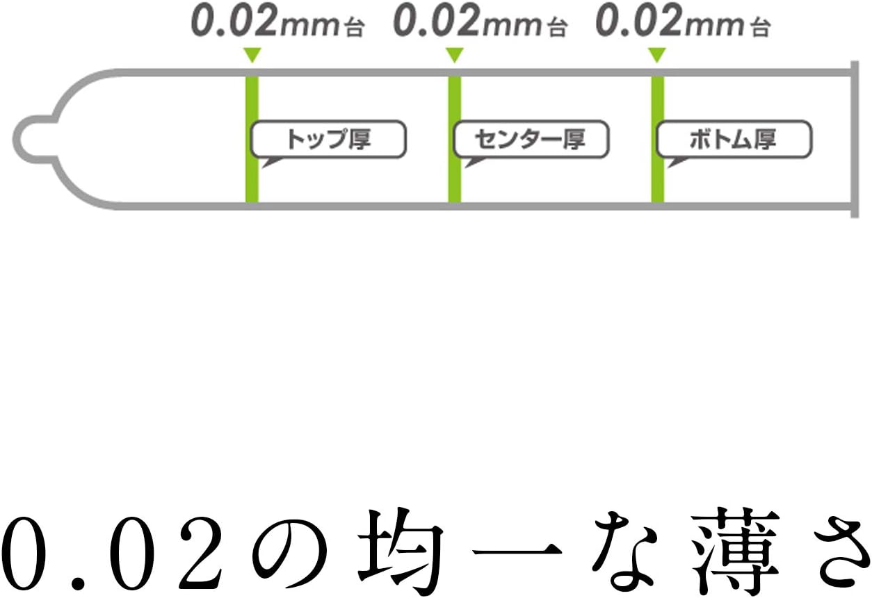 オカモトのコンドーム002(ゼロツー)は驚くほどのやわらかさ。装着時の締め付け感がなく、ぬくもりや感触をそのままに伝えます。根元から先端まで均一な薄さを実現。コンドーム全ての部分が0.02ミリ台という薄さなので、使用時の感度が違います。根元は本シリーズのレギュラー品と同サイズ、先端は幅広タイプです。
