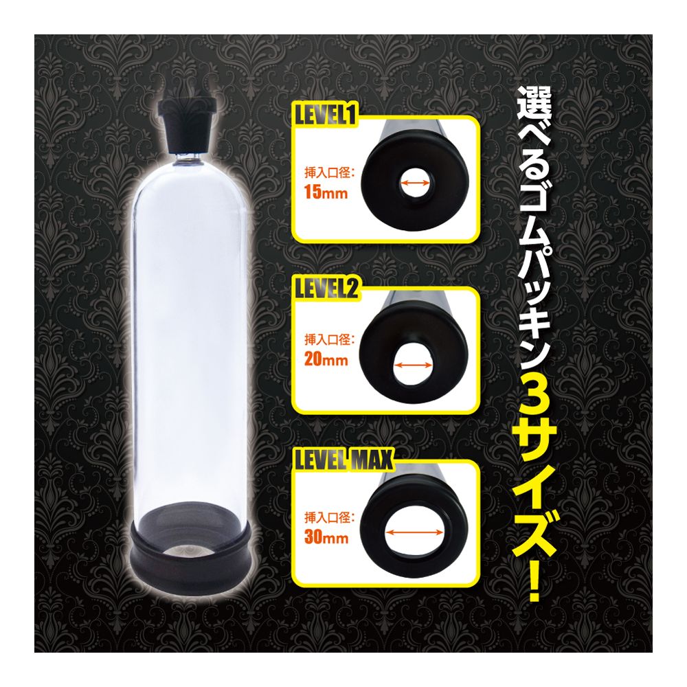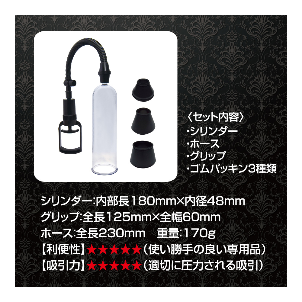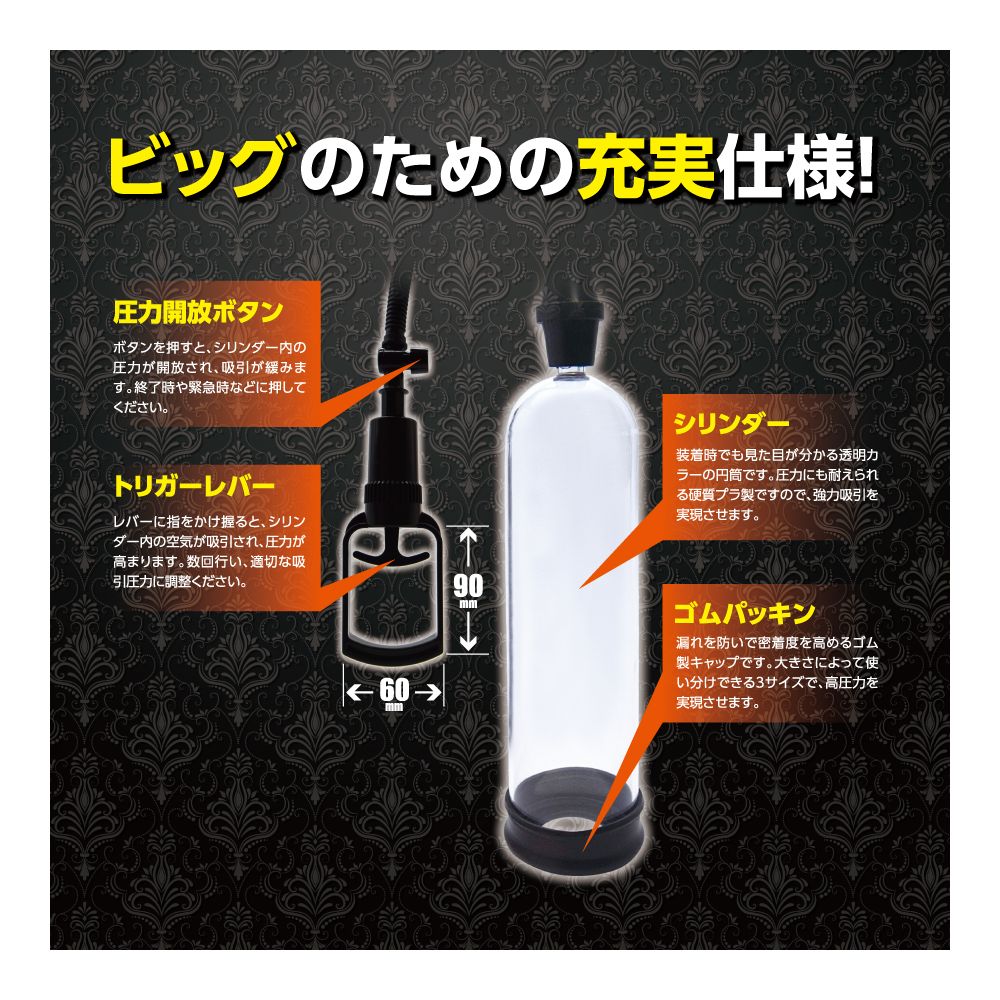 吸引でビッグになれ!大きい男になるための増●ポンプが新登場!片手で握れるトリガーレバー、ワンプッシュの圧力開放ボタン、大きさが目で分かる透明シリンダー、サイズが選べる3種類のゴムパッキン、と必要なものを全て揃えました!レバーを握って空気を吸って、吸引圧力でメンズをビッグにしましょう!トリガーレバーは手動式なので、微細な調整もコントロール簡単!圧力開放ボタンは安心設計、ワンプッシュで吸引キャンセル!シリンダーは憧れサイズにぴったりな、内寸長180ミリ×内径48ミリ!挿入口のゴムパッキンは、選べる3サイズ(15ミリ、20ミリ、30ミリ)!ボーイは吸引でビッグになれ!