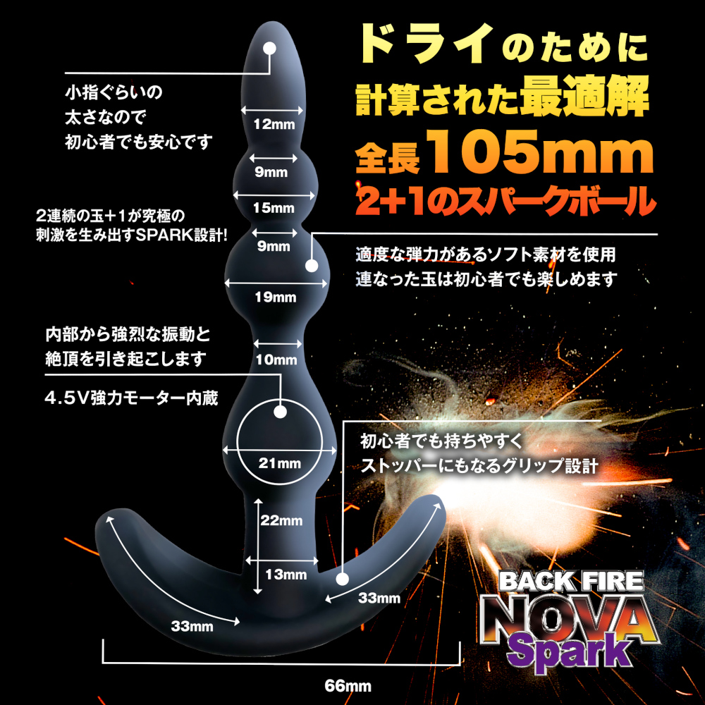 スパークは、座●サイズほどの10mmの先端から始まり、2連続の15mm&19mmの玉が続き、最後は内部にローターを搭載した21mmの玉が待ち構え、全部で4箇所の隆起を体験する設計になっています。