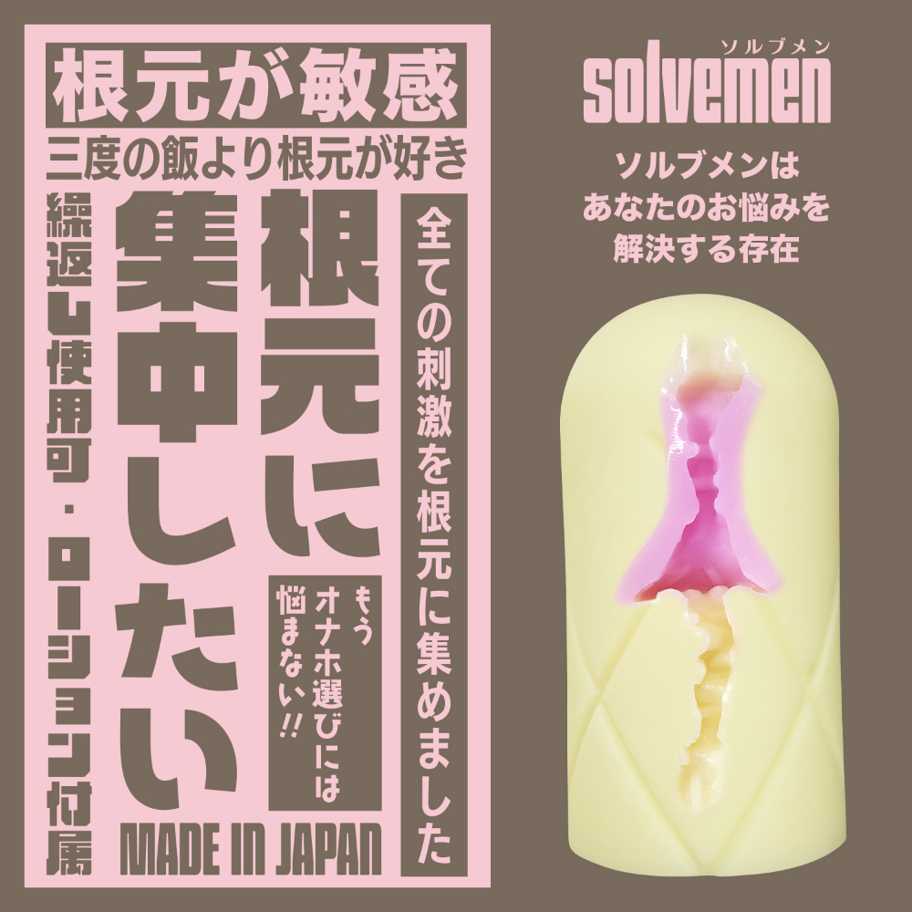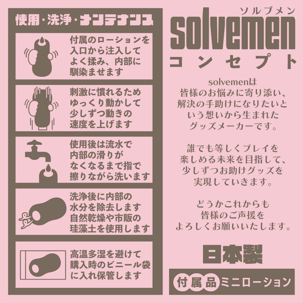 ソルブメンはあなたのお悩みを解決する存在です。「カ〇を攻められるのがとにかく好きなんだ」「根〇を締め付けられるのがたまらなくイイ」個人の好みによってGOODポイントは異なります。そんな個性に全力で応えたいです。それがソルブメンの生まれた意味だと思いませんか?もっちり刺激のアウターで確かな包まれ感をお約束。その上で、ピンポイントでアナタの敏感な部分をアタック!オナホールの可能性を感じてください。これは性癖に応えた正統進化と言っても過言ではありません。あなたはオナホ選びに悩む必要はなくなります。あなたのためにソルブメンがいるのです。安心安全の日本製で繰り返し何度でも利用が可能です。