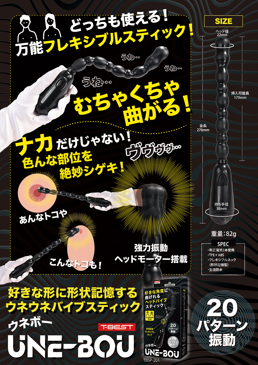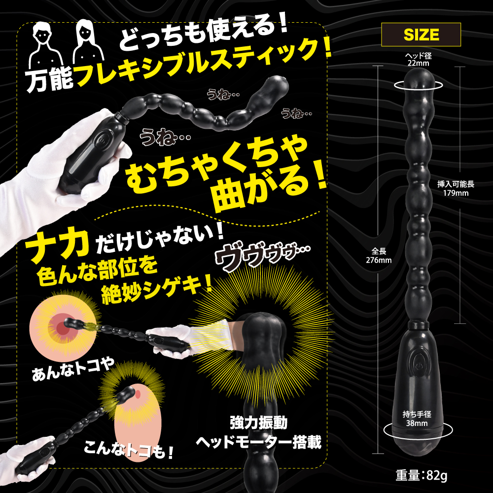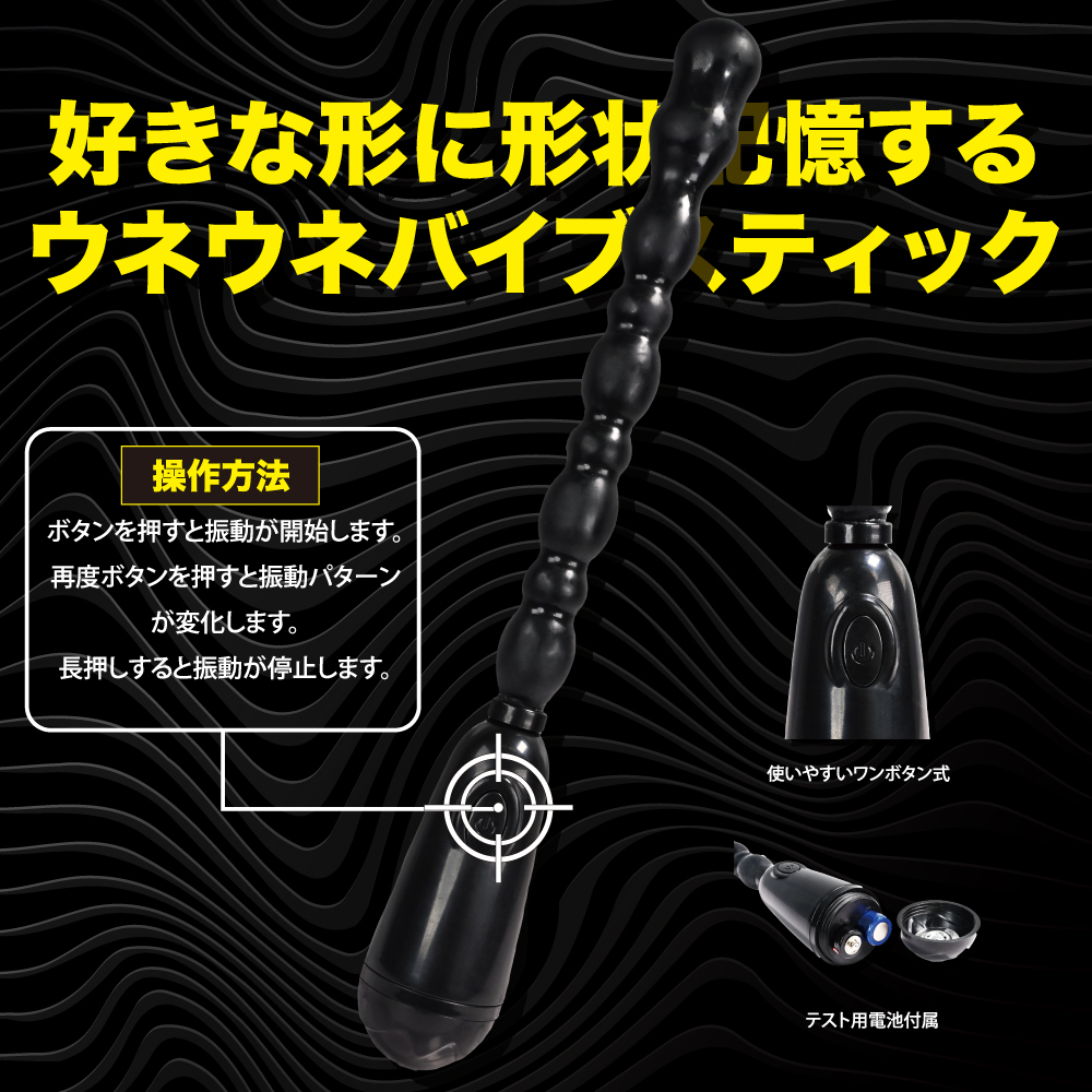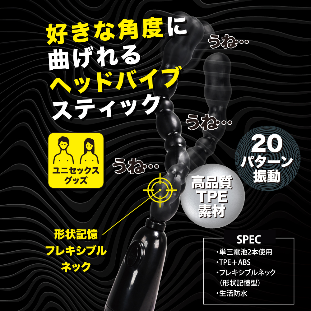 好きなカタチに形状記憶するウネウネ楽しいバイブスティック。ユニセックスで楽しめるヘッドバイブを搭載したフレキシブルスティック。好きな形状でどっちもお使い頂けます。アクションパターンは20パターンと色んな振動を楽しめます。ストレス臭カットの高品質エラストマー素材採用。奥でしっかり振動するアクションスティックです。