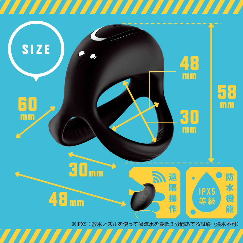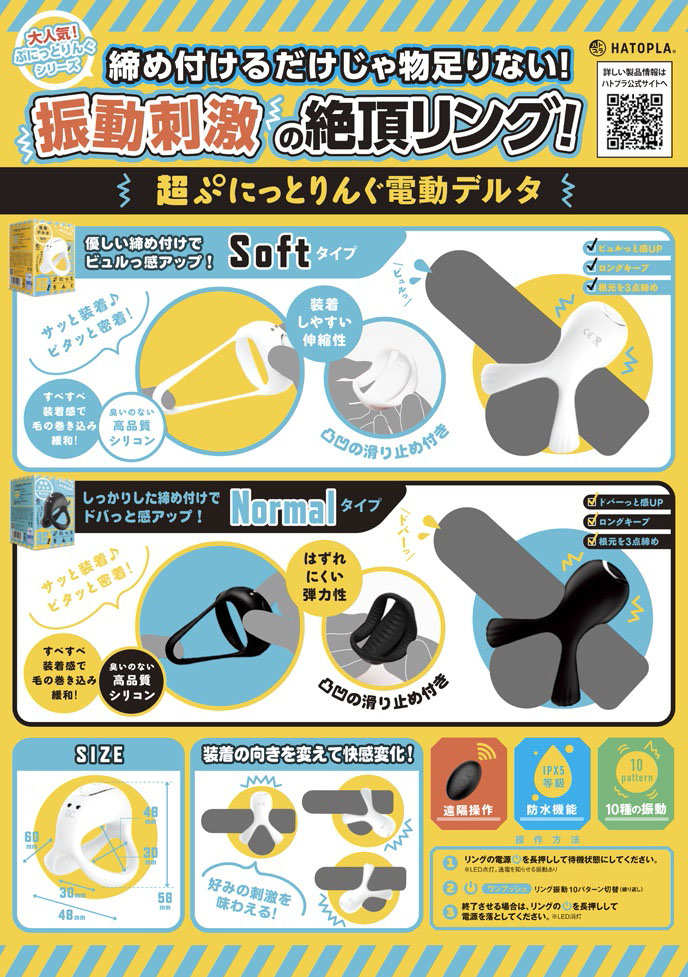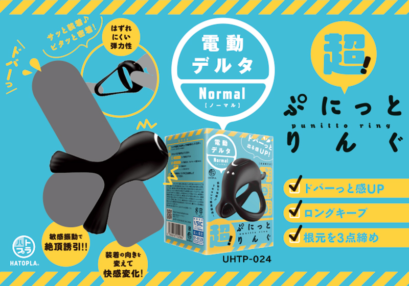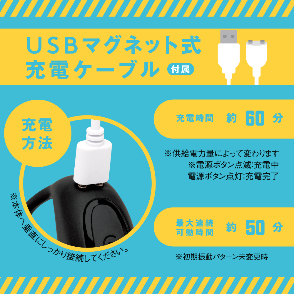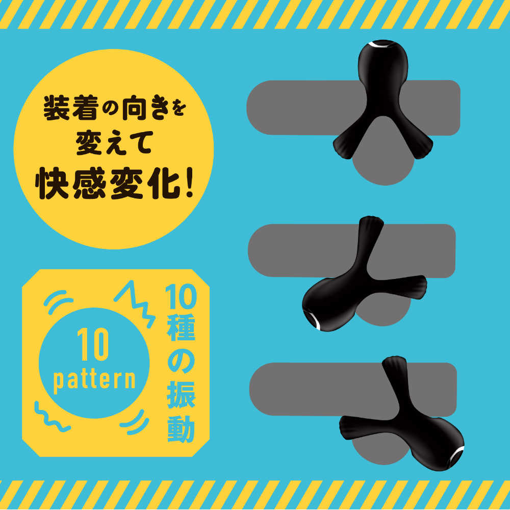 超!ぷにっとりんぐから電動verが登場。敏感振動で快感&絶頂誘引!更にリモコンで絶頂タイミングをコントロール可能!サッと装着♪ピタッと密着!はずれにくい弾力性で根元を3点締めしてくれるデルタ形状のノーマル仕様。装着の向きを変えれば快感も変化します。臭いのない高品質シリコンで着けてるストレスを軽減!しっかり締め付け、勃ちの維持!萎え気味の竿の補強!イキ抑制!フィット面に施された滑り止めがズレを軽減し、皮戻り防止にも便利です。ドバー っと出る感UPできゅーっと超極楽発射!本体は充電式なのでエコに使用可能。※本体:充電時間約60分※本体:最大連続可動時間約50分(初期振動パターン未変更時)_IPX5等級_10パターン振動_付属品:USBマグネット式充電ケーブル※IPX5:放水ノズルを使って噴流水を最低3分間あてる試験(浸水は不可となります)
