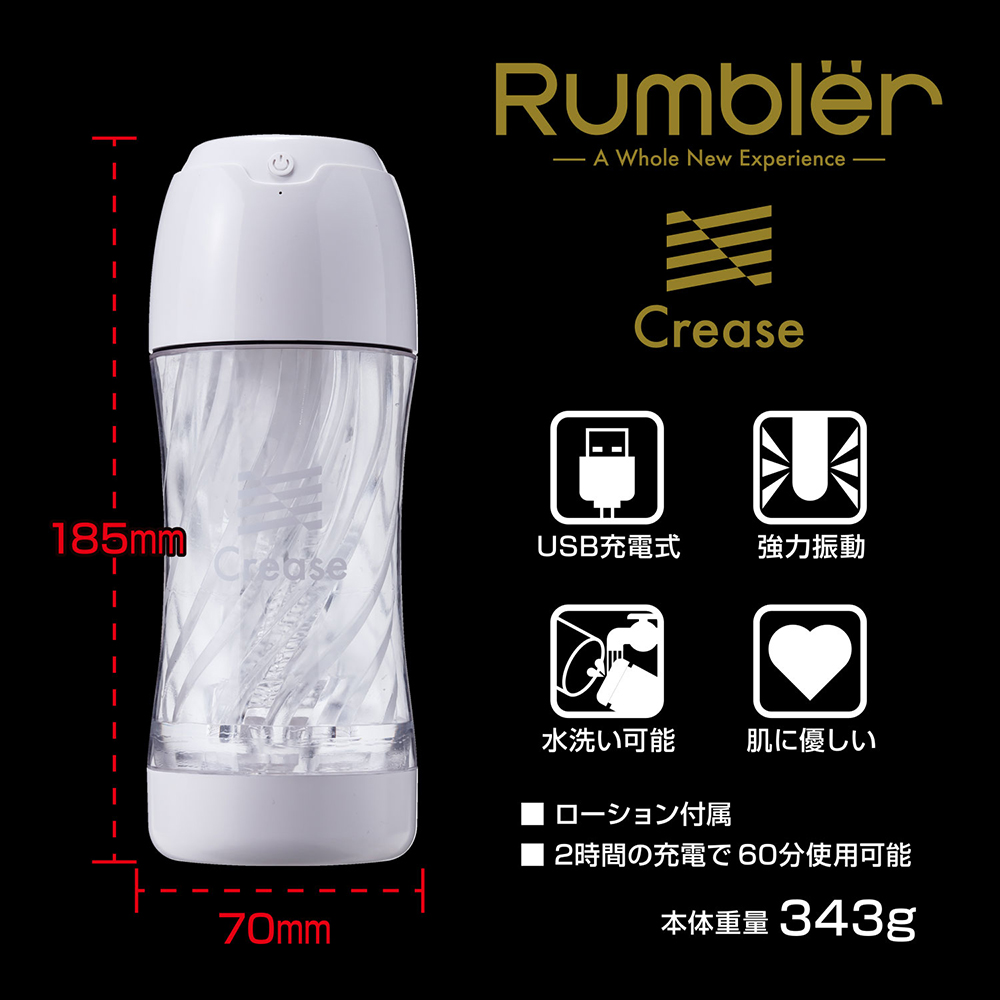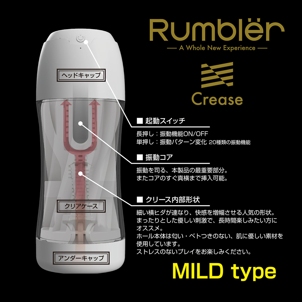 振動刺激に特化したセルフケアカップが登場しました。次世代のセルフケアを担うに相応しい逸品です。このクリースは細いヒダが幾重にも連なった人気の高い形状、刺激を増幅させながらもまったりと長く楽しめるホールです。ソフトでマイルド、けれど確実に絶頂へ導いてくれるでしょう。また壁面に刻まれた細ヒダは振動とも相性抜群。振動を確実にペ〇スへと伝え、内側から快感を増幅させてくれます。最大の特徴である振動は、パワフルにしてきめ細やか。USB充電タイプだからこその力強さと、どんなスタイルにもピッタリとハマる20種類の振動で、多くのユーザーを昇天へと誘うことでしょう。本作は非貫通方式を採用し、心地よい吸引感を満喫することが可能です。またホールは簡単にカップから取り出し、水洗いすることができるので、いつまでも清潔に何度でも使うことができます。「振動刺激」という新たな快感の形を示した「Rumbler」。その醍醐味を思う存分、味わってください。