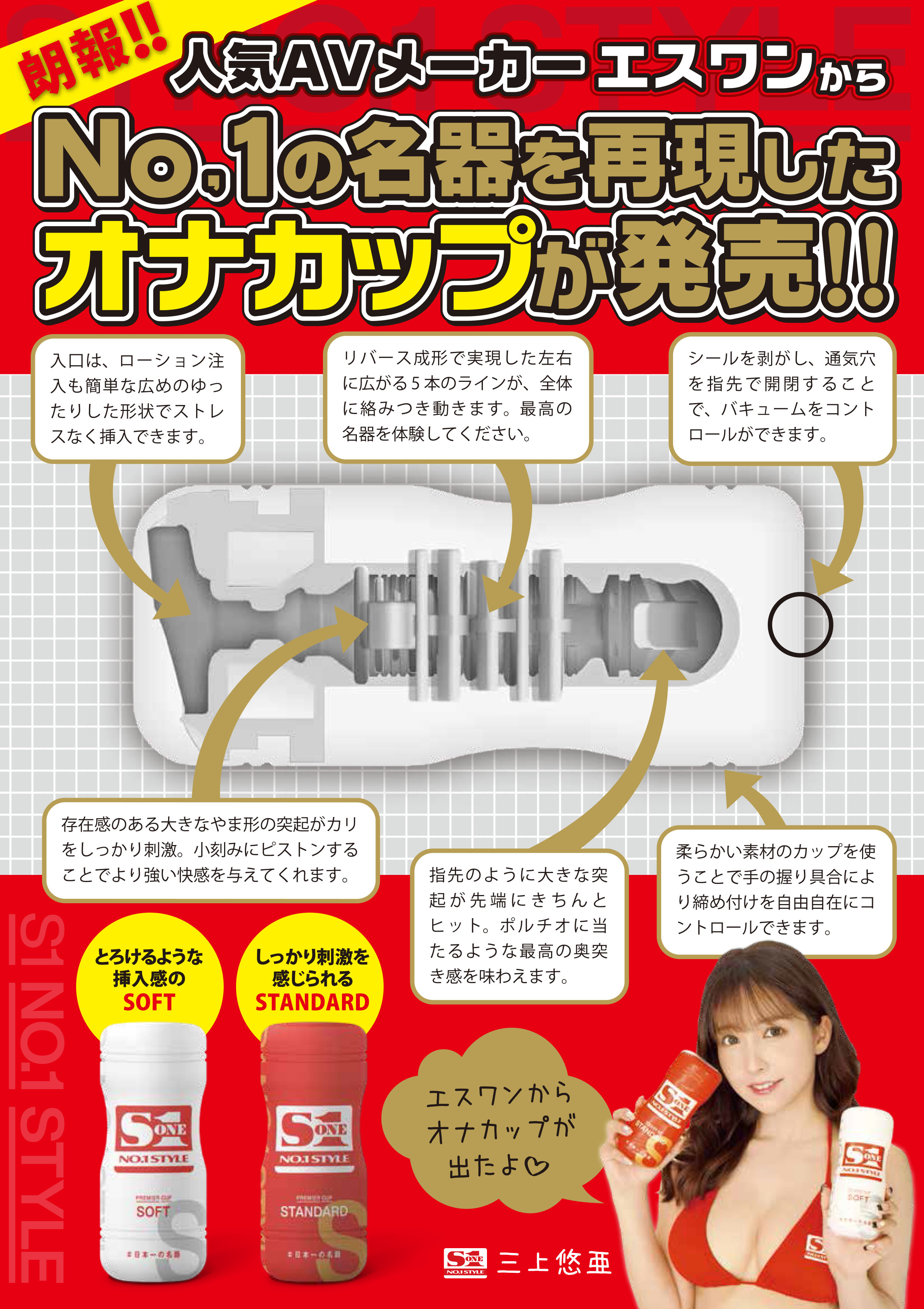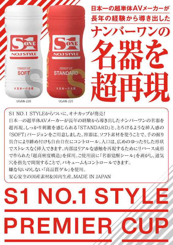 S1 NO.1 STYLEからついに、オナカップが発売!日本一の超単体AVメーカーが長年の経験から導き出したナンバーワンの名器を超再現。しっかり刺激を感じられる「STANDARD」と、とろけるような挿入感の「SOFT」バージョンをご用意しました。容器は、ソフト素材を使うことで、手の握り具合により締め付けも自由自在にコントロール。入口は、広めのゆったりした形状でストレスなく挿入できます。内部はリアルな感触を再現するためにリバース成形で作られた「超高密度構造」を採用。ご使用前に「名器覚醒シール」を剥がし、通気穴を指先で開閉することで、バキュームもコントロールできます。嫌な匂いのしない「高品質ゲル」を使用。安心安全の国産素材&国内生産。
