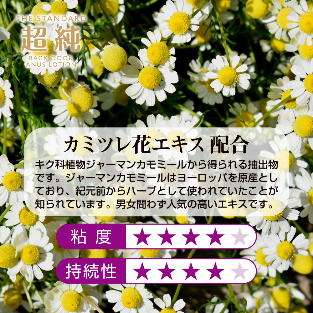 人気の超純シリーズに、さらなる高みへと導くバックドアローションが登場です。潤いが長時間持続し、よりきめ細やかな滑らかさに仕上げました。カミツレ花エキスを配合し、肌への配慮も万全です。また国内製造に加え、化粧品登録済みの本製品だから、安心してデリケートな箇所にご使用いただけます。便利なワンタッチキャップを採用し、使いやすさも抜群です。ローション選びに迷ったら超純で間違いなし!