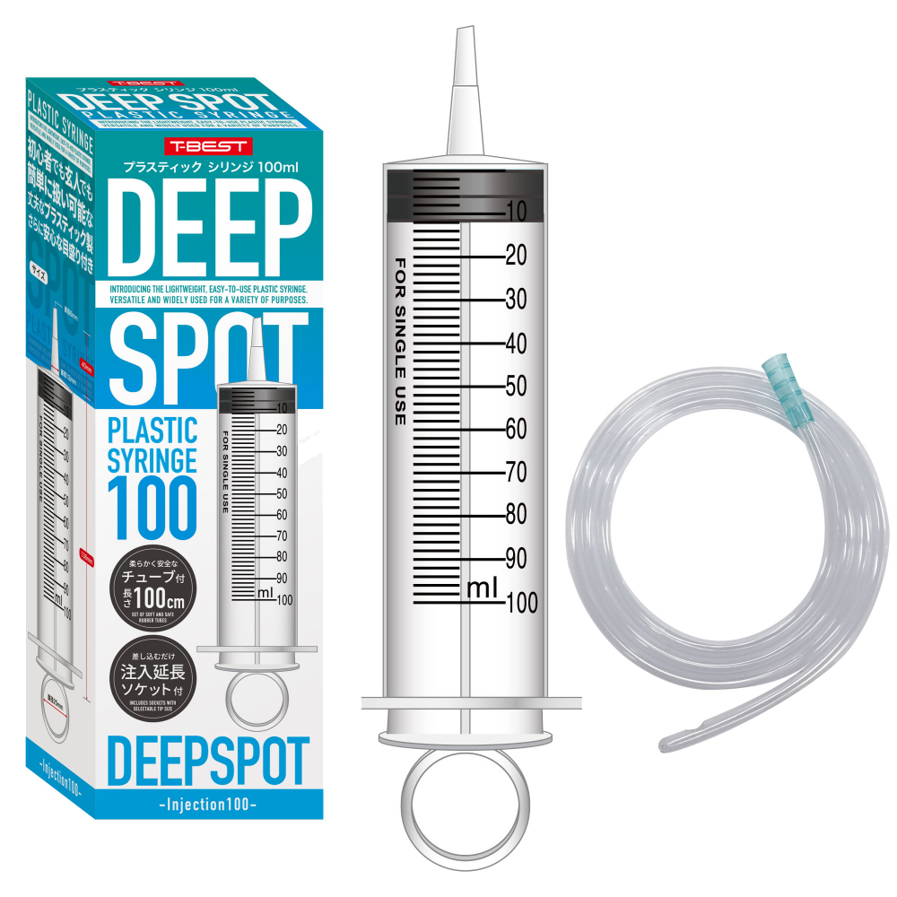 軽くて使いやすいプラスティクシリンジの登場!用途に合わせて多目的に幅広く使用可能。本体は初心者でも玄人でも簡単に扱い可能な丈夫なプラスティク製。さらに安心な目盛り付きで柔らかく安全なゴム製のチューブがセットになってます。チューブの長さは余裕の100cm、セルフでもカップルでも楽しめる仕様です。シリンジのサイズは100mlで片手で手軽に扱えます。この商品は、医●品医療機器等法に基づく医療機器ではありません。本品はジョークグッズです。その他の目的でご使用された場合の責任は一切負いません。