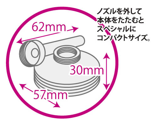 130mlと十分な容量ながらノズルを外して本体をたためば、こっそり忍ばせられるほどコンパクトに収納可能です。