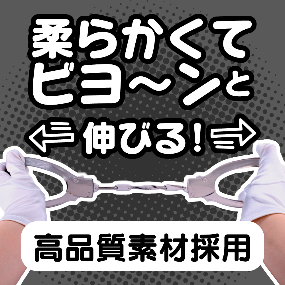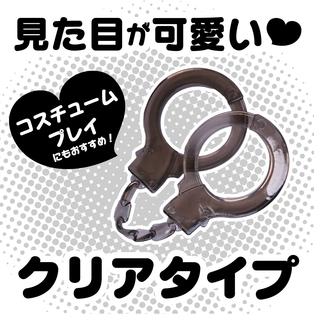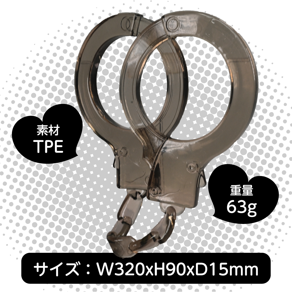柔らかくてビヨーンと伸びる素材のソフトSMにピッタリの手錠型手枷です。<>伸縮性のある素材だから装着するのも外すのもとっても簡単です。<>よく伸びるので手枷としてだけではなく、足枷としてもご使用いただけます。(※無理のない範囲でご使用ください)。<>お気軽にSM気分を楽しめる可愛い見た目のクリア素材TPE手錠。