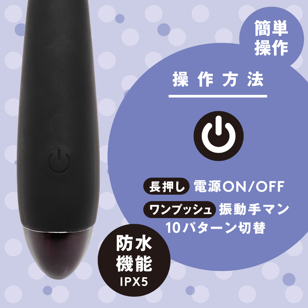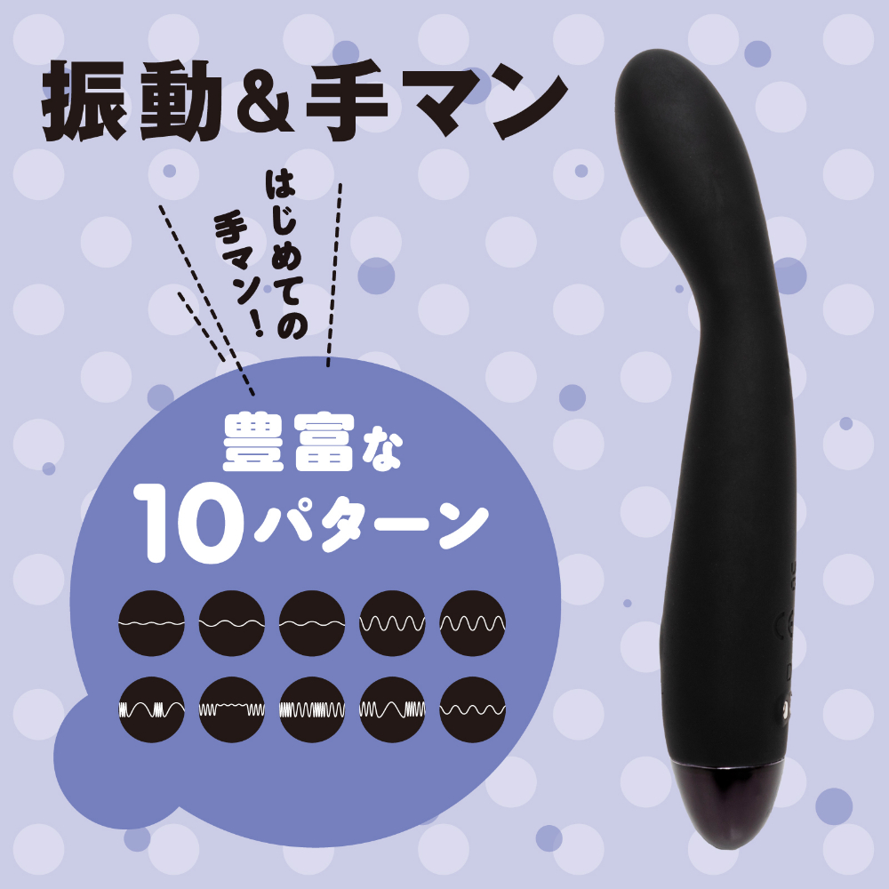 「はじめて」の人に選んでほしい。コンパクトボディでもしっかりイケる、手マン10パターン。手が疲れない軽量設計55g。ボタン一つで簡単操作。USB充電ケーブル付属。防水機能IPX5。※IPX5:放水ノズルを使って噴流水を最低3分間あてる試験(浸水は不可となります)※本体:充電時間約90分※本体:最大連続可動時間約60分(初期振動パターン未変更時)