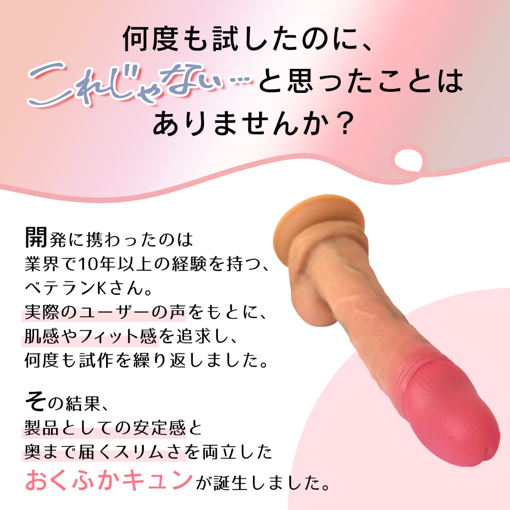 リアルな肌感を追求した次世代ディルド「おくふかキュン」が登場!スリム&フィット設計で、初めての方でも安心して奥深い快感を体験できます。柔らかな表面としっかりした芯を兼ね備えた二層構造により、まるで人肌に触れているかのような自然なフィット感を実現。高品質な液体シリコンを使用し、滑らかな使用感と高い耐久性を両立。固いディルドが苦手な方にも理想的なプレジャーをお届けします。心地よさと安心感を兼ね備えた「おくふかキュン」で、新しい体験をお楽しみください。全長:18cm挿入可能長:14cm最大径:3.5cm