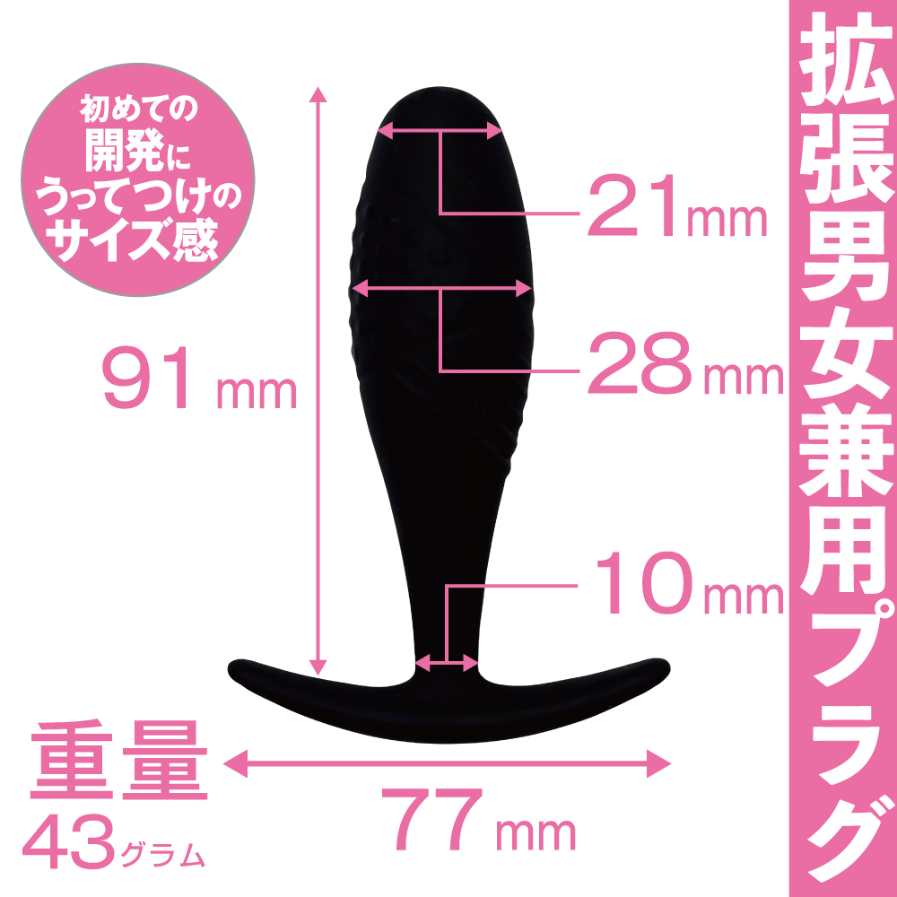 男女兼用拡張用プラグ。拡張することでア〇ルプレイの幅が広がる。初心者向けの小型サイズ。ア〇ルを広げてプレイの幅を広げる、拡張用プラグ。最大幅28mmと、拡張初心者にもおすすめしやすい小型サイズです。長期間挿入して生活することで、徐々に拡張できます。硬すぎないソフトシリコン製で、緩やかなカーブを描いており、スムーズに挿入できて安心。洗浄も簡単なので清潔に使用できます。