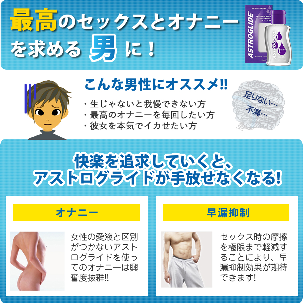 アストログライド独自の低刺激フォーミュラはグリセリン、パラベンに対して敏感な方に最高の選択肢です。より満足度の高いセックスに導くだけでなく、セックス中の不安を緩和いたします。水溶性のこの製品はベタつかず簡単に洗い流せて、大人のおもちゃやコンドームと安心してご使用出来る幅広いニーズに対応するマルチな製品です。