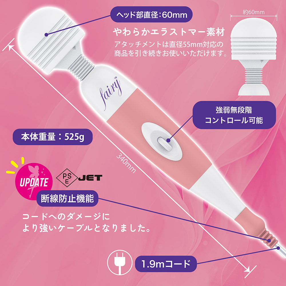 【PSEJET】取得で安全・安心にアップデート!最強の振動と無段階コントロールの強力アイテム!Fairy(フェアリー)がリニューアル。潮吹き失神者続出のGスポット直撃、あの電動バイブレーターがヴァージョンアップして登場しました。それまでの電マとは一線を画したこの無段階コントロール仕様が、フェアリーの爆発的なヒットの理由とも言えます。電マと言えばこのフェアリー。業界御用達の定番中の定番ですから、もはや説明の必要はないかも知れません。女性らしい優しいピンクのボディも好評です。もちろん家庭用電源コンセント使用ですから、どんなに長時間責めてもOK。お好きなパワーで振動を存分にお楽しみください。本体根元の断線を防止する断線防止機能を新たに追加!より長く安全にご使用いただけます。